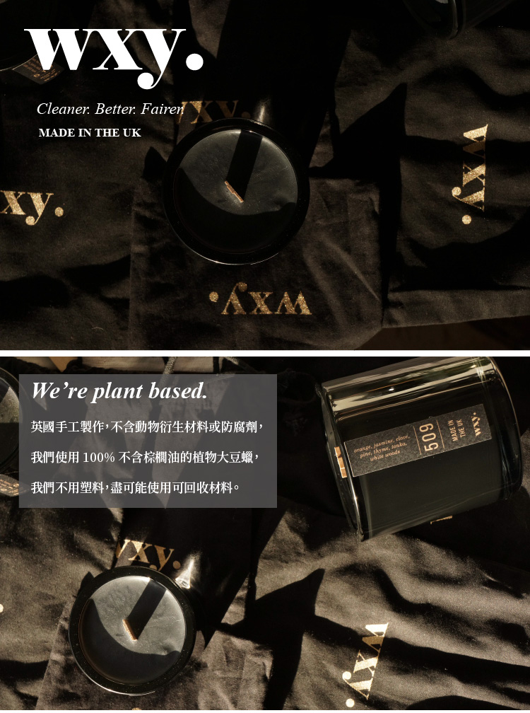 英國手工製作,不含動物衍生材料或防腐劑,使用 100% 不含棕櫚油的環保植物大豆蠟,wxy只專注於讓香味說話,為每一種心情和每一種場景創造記憶——wxy希望每個人都可以重複使用燭杯作為收納容器、植栽器皿..或者可能是更具創新性的東西。