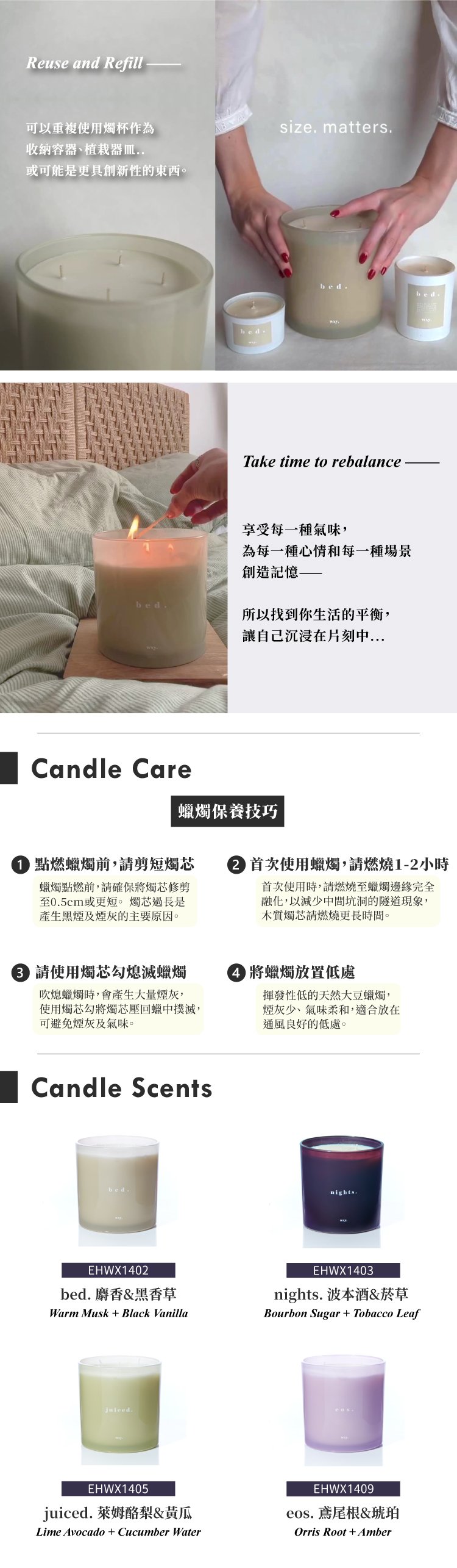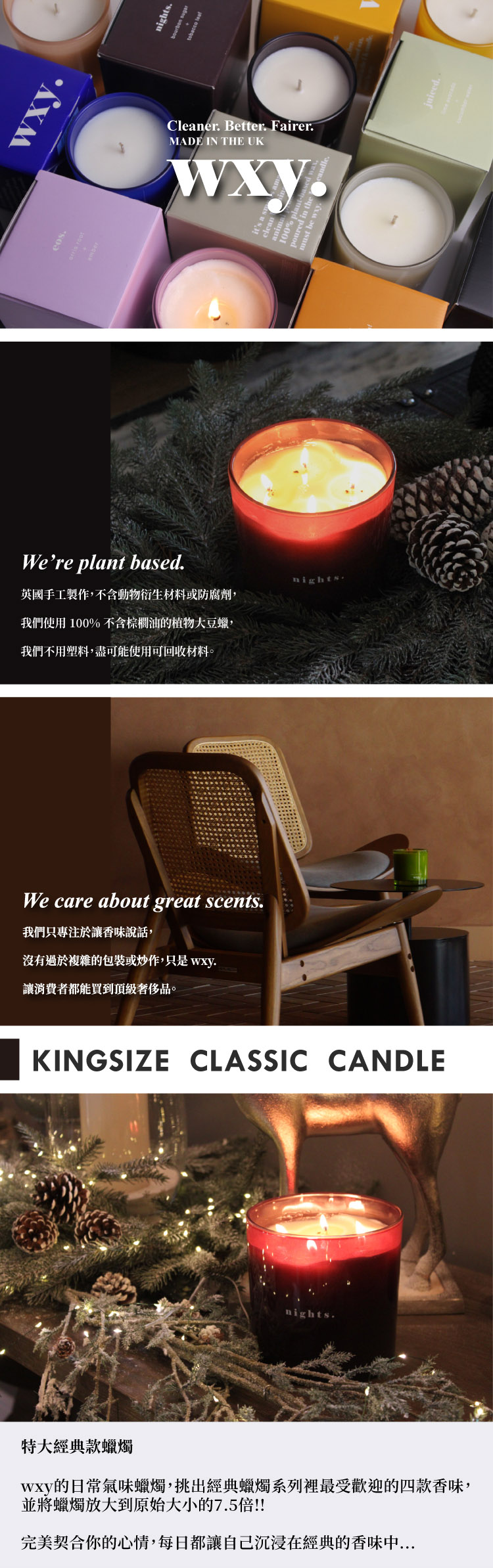 英國手工製作,不含動物衍生材料或防腐劑,使用 100% 不含棕櫚油的環保植物大豆蠟,wxy只專注於讓香味說話,為每一種心情和每一種場景創造記憶——wxy希望每個人都可以重複使用燭杯作為收納容器、植栽器皿..或者可能是更具創新性的東西。