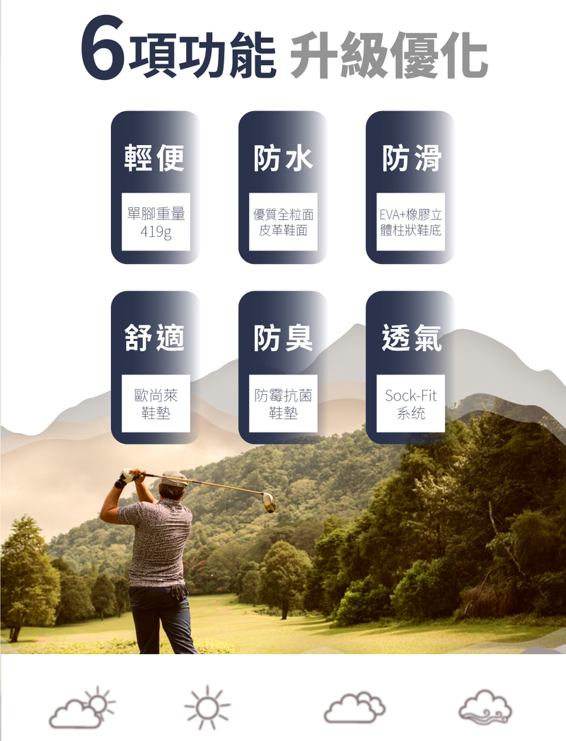 1.ACE CASUAL高爾夫系列,專利織物結合外層防水膜、內層專利織物排溼,提供內外防水與舒適透氣。