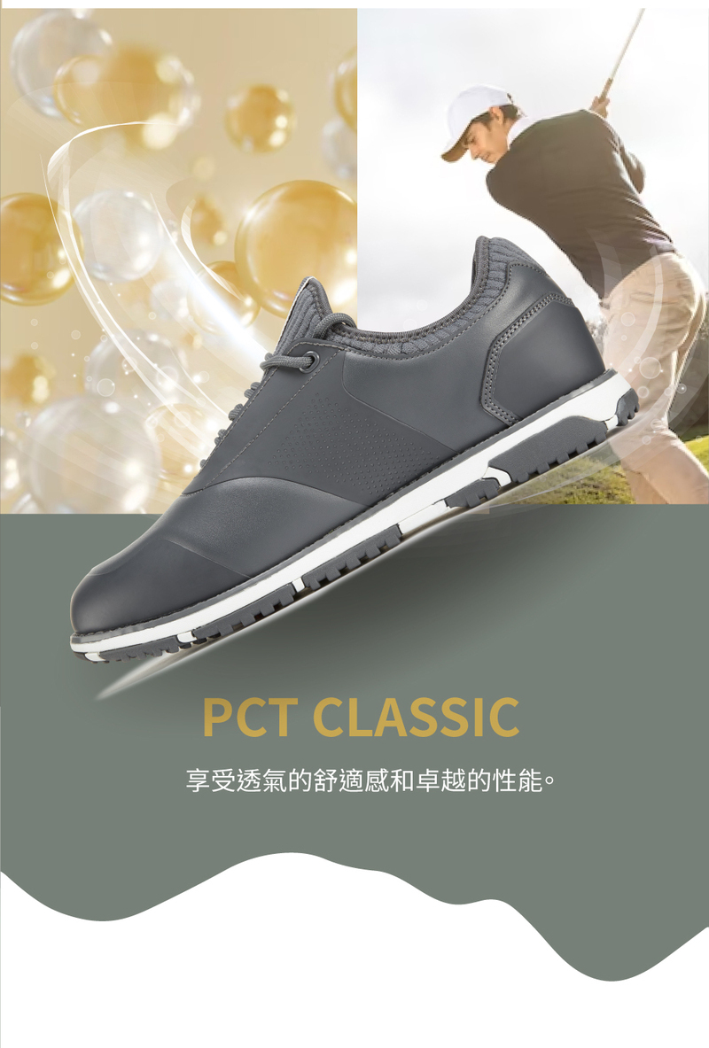 1.PCT CLASSIC經典高爾夫系列,牛皮表層結合防水膜、內層專利織物排溼,提供內外防水與舒適透氣