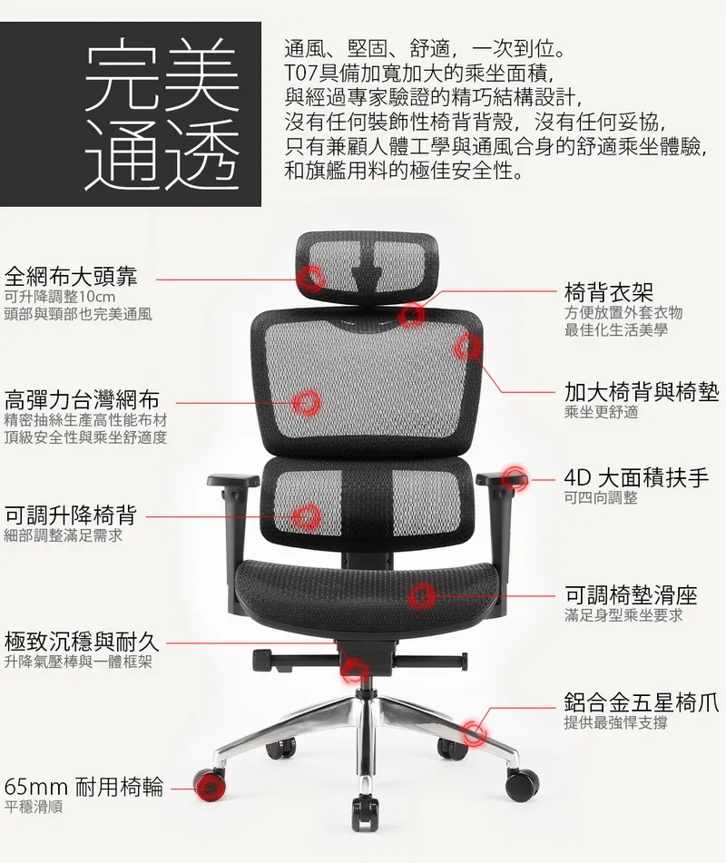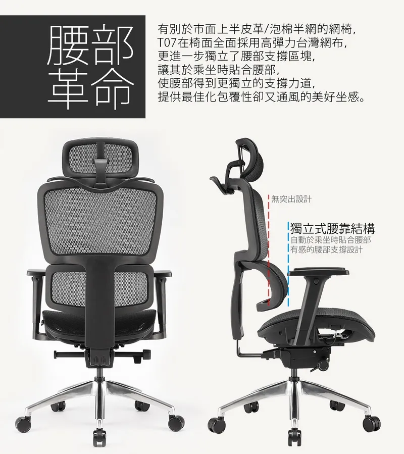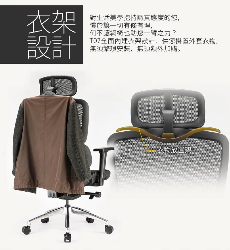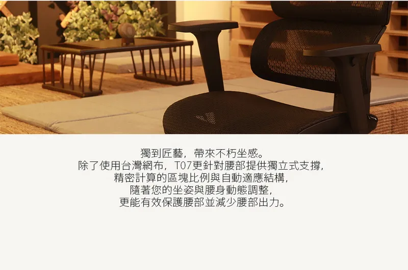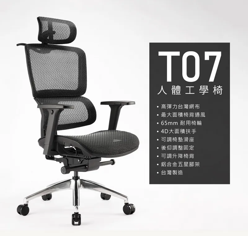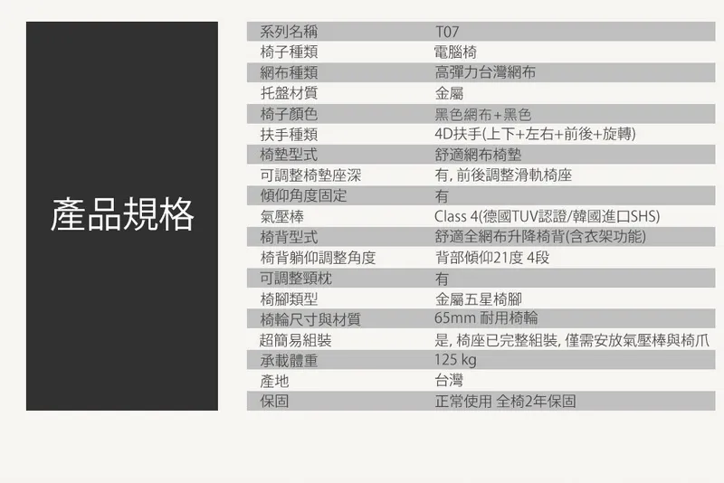 系列名稱:T07 椅子種類:電腦椅 網布種類:高彈力台灣網布 托盤材質:金屬 椅子顏色:黑色網布+黑色 扶手種類:4D扶手(上下+左右+前後+旋轉) 椅墊形式:舒適網布椅墊 可調整椅墊座深:有,前後調整滑軌椅座 傾仰角度固定:有 氣壓棒:Class 4(德國TUV認證/韓國進口SHS) 椅背形式:舒適全網布升降椅背(含衣架功能) 椅背躺仰調整角度:背部傾仰21度 4段 可調整頸枕:有 椅腳類型:金屬五星椅腳 椅輪尺寸與材質:65mm耐用椅腳 自行組裝:是(簡易組裝) 乘載體重:125KG 產地:台灣 保固:正常使用 兩年保固,詳情請參閱說明書
