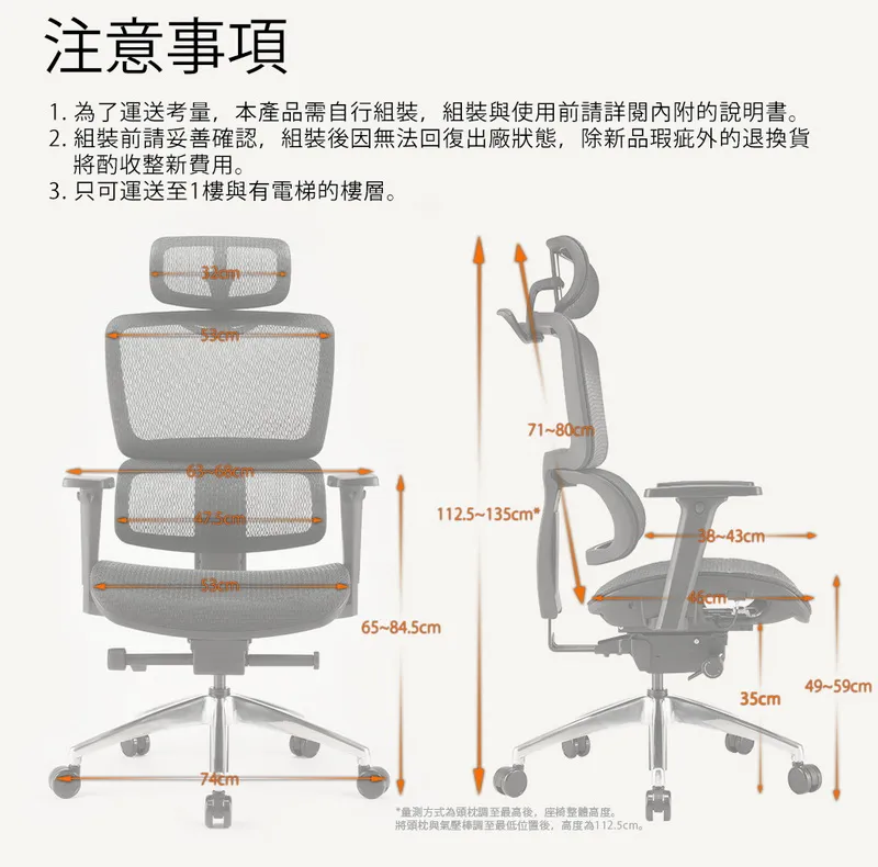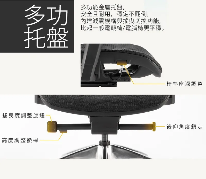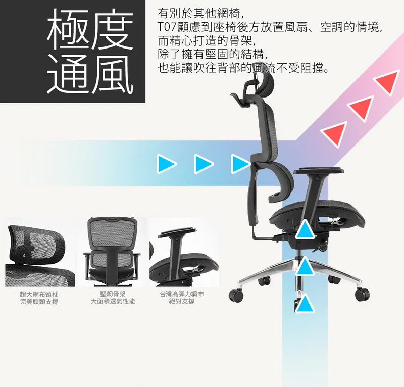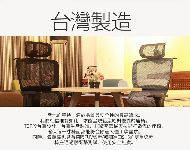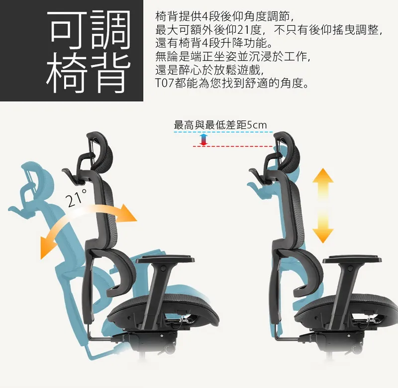 系列名稱:T07 椅子種類:電腦椅 網布種類:高彈力台灣網布 托盤材質:金屬 椅子顏色:黑色網布+黑色 扶手種類:4D扶手(上下+左右+前後+旋轉) 椅墊形式:舒適網布椅墊 可調整椅墊座深:有,前後調整滑軌椅座 傾仰角度固定:有 氣壓棒:Class 4(德國TUV認證/韓國進口SHS) 椅背形式:舒適全網布升降椅背(含衣架功能) 椅背躺仰調整角度:背部傾仰21度 4段 可調整頸枕:有 椅腳類型:金屬五星椅腳 椅輪尺寸與材質:65mm耐用椅腳 自行組裝:是(簡易組裝) 乘載體重:125KG 產地:台灣 保固:正常使用 兩年保固,詳情請參閱說明書