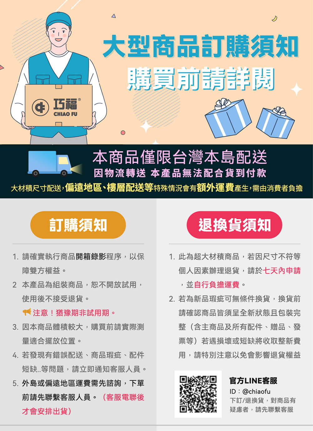 - 此商品屬於大型物件,如欲退換貨,大型物件退貨會酌收運費,每箱金額按照退貨時物流標準來計算。