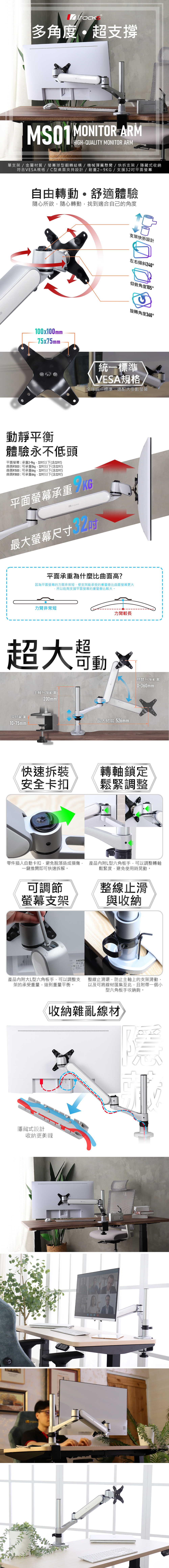 • 標準VESA 75x75與100x100孔距,適用於市面大多數螢幕