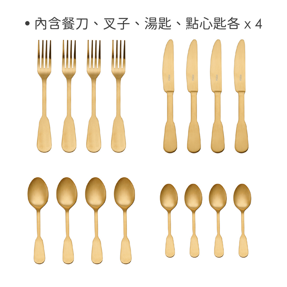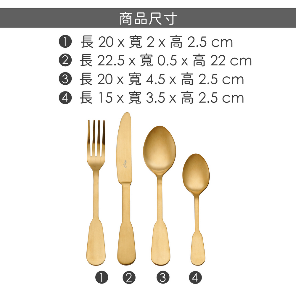 尺寸:叉子長 20 x 寬 2 x 高 2.5 cm、刀子長 22.5 x 寬 0.5 x 高 22 cm、湯匙長 20 x 寬 4.5 x 高 2.5 cm、點心匙長 15 x 寬 3.5 x 高 2.5 cm