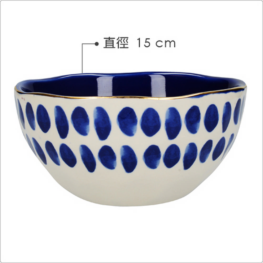 ※ 靛藍色的暈染圖樣搭配波浪形碗緣與金邊裝飾,營造雅緻的用餐氛圍。