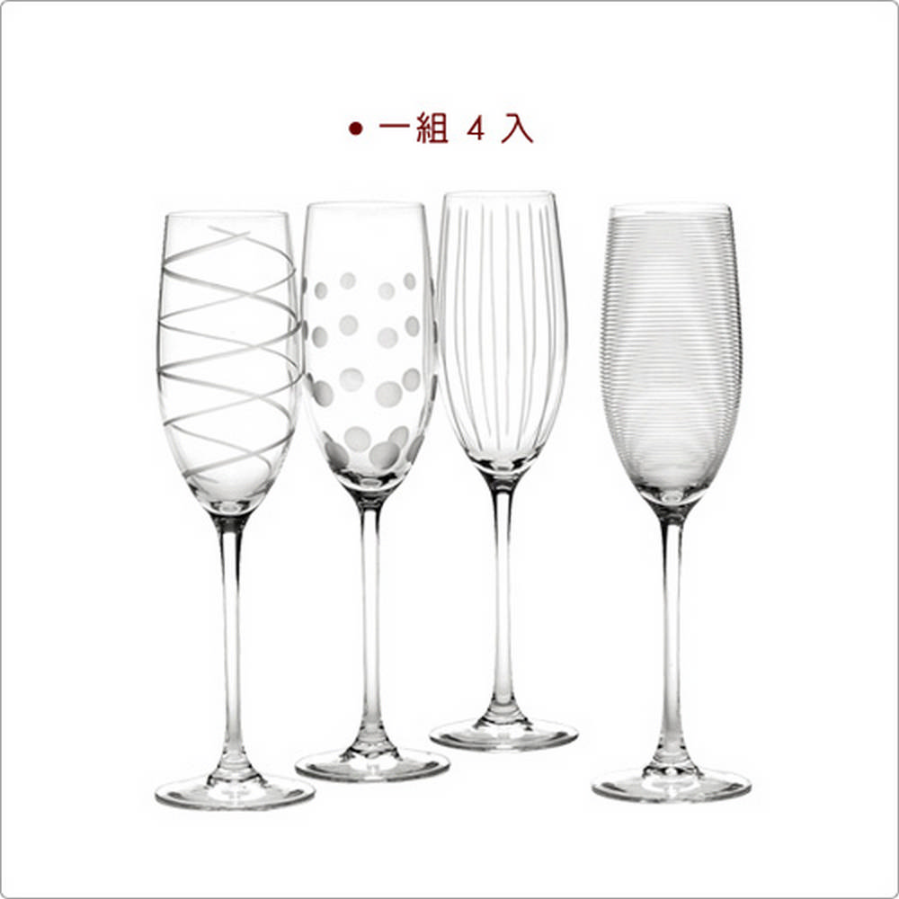 Mikasa 系列注重餐食的細節,以雅緻設計貫穿食器、餐桌週邊實用的本質,其用餐美學值得您細細品味。毎只 Cheers 酒杯擁有獨特的花紋設計 (圓點、線圈、直紋及螺旋紋),可依心情選用;多人舉杯共飲時,亦有利辨識避免錯拿。此款笛型香檳酒杯,細長杯身和狹窄杯口的設計,能看見香檳酒、氣泡酒的氣泡緩緩升起,增加視覺享受;高腳設計能避免手溫影響酒的口感。