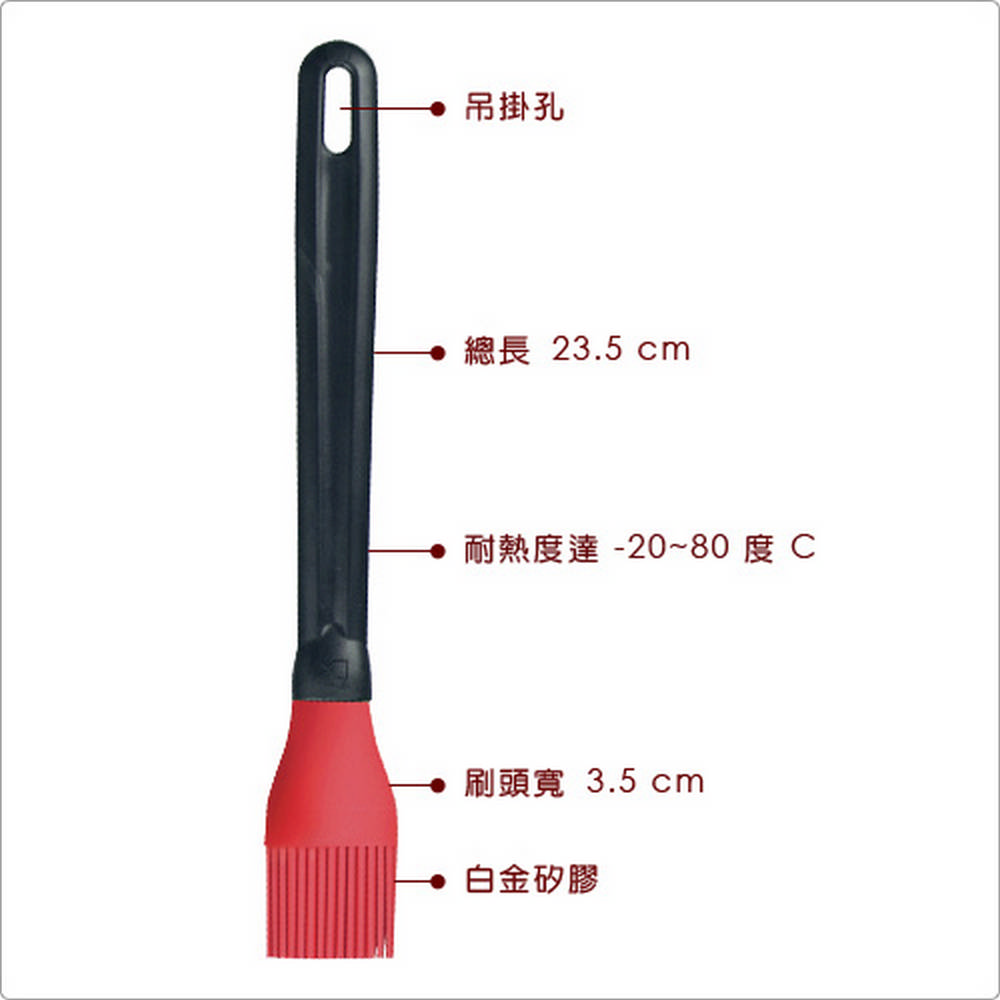 本商品一件入、刷頭耐熱度 -60~220 度C、握柄耐熱度 -20~80 度C (請遠離直接火源)、適用洗碗機、不沾鍋具。製作糕點時需塗抹奶油、果醬或蜂蜜等;歡樂烤肉時,食材需塗抹美味烤肉醬,推薦您此款刷毛富彈性且塗醬均勻的醬料刷。耐高溫,您也可當作平底鍋均勻抹油的幫手,減少油份熱量的攝取。可吊掛收納省空間。