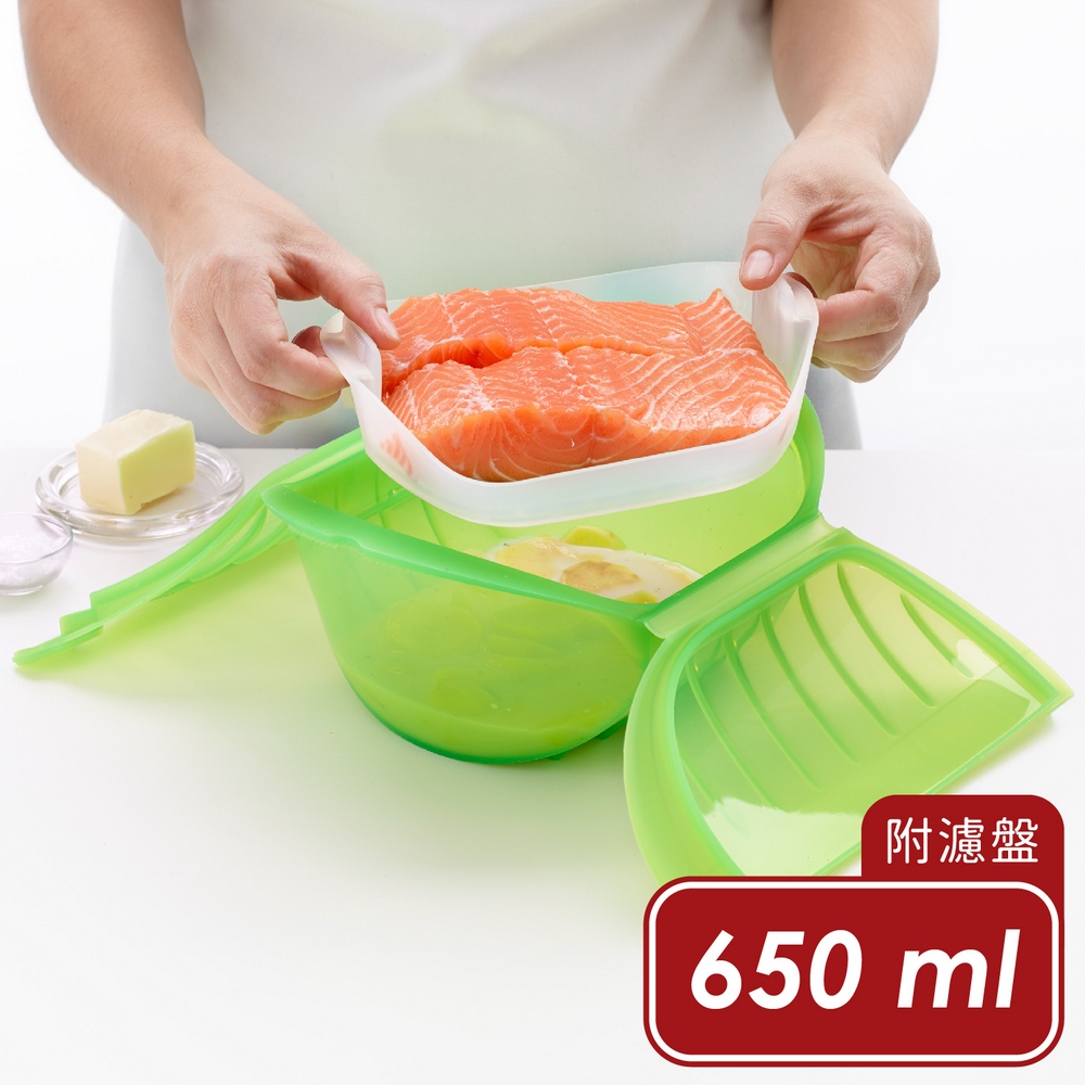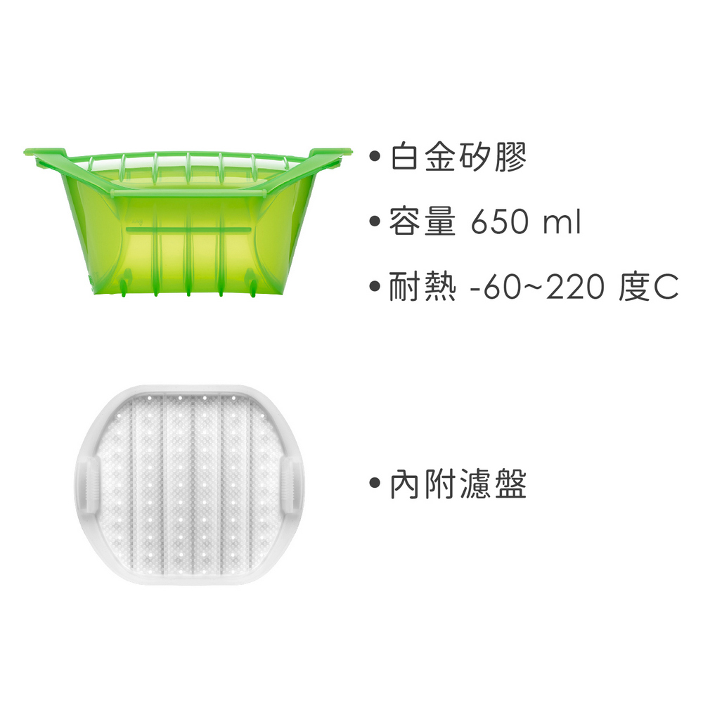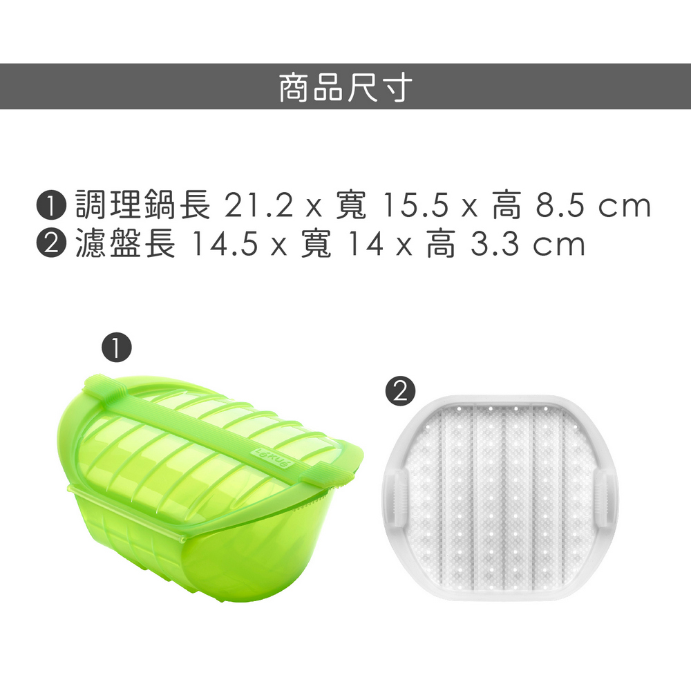 尺寸:調理鍋長 21.2 x 寬 15.5 x 高 8.5 cm、濾盤長 14.5 x 寬 14 x 高 3.3 cm