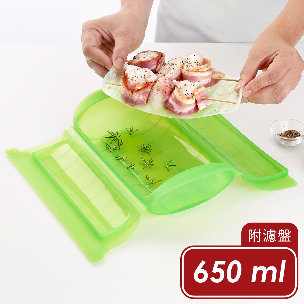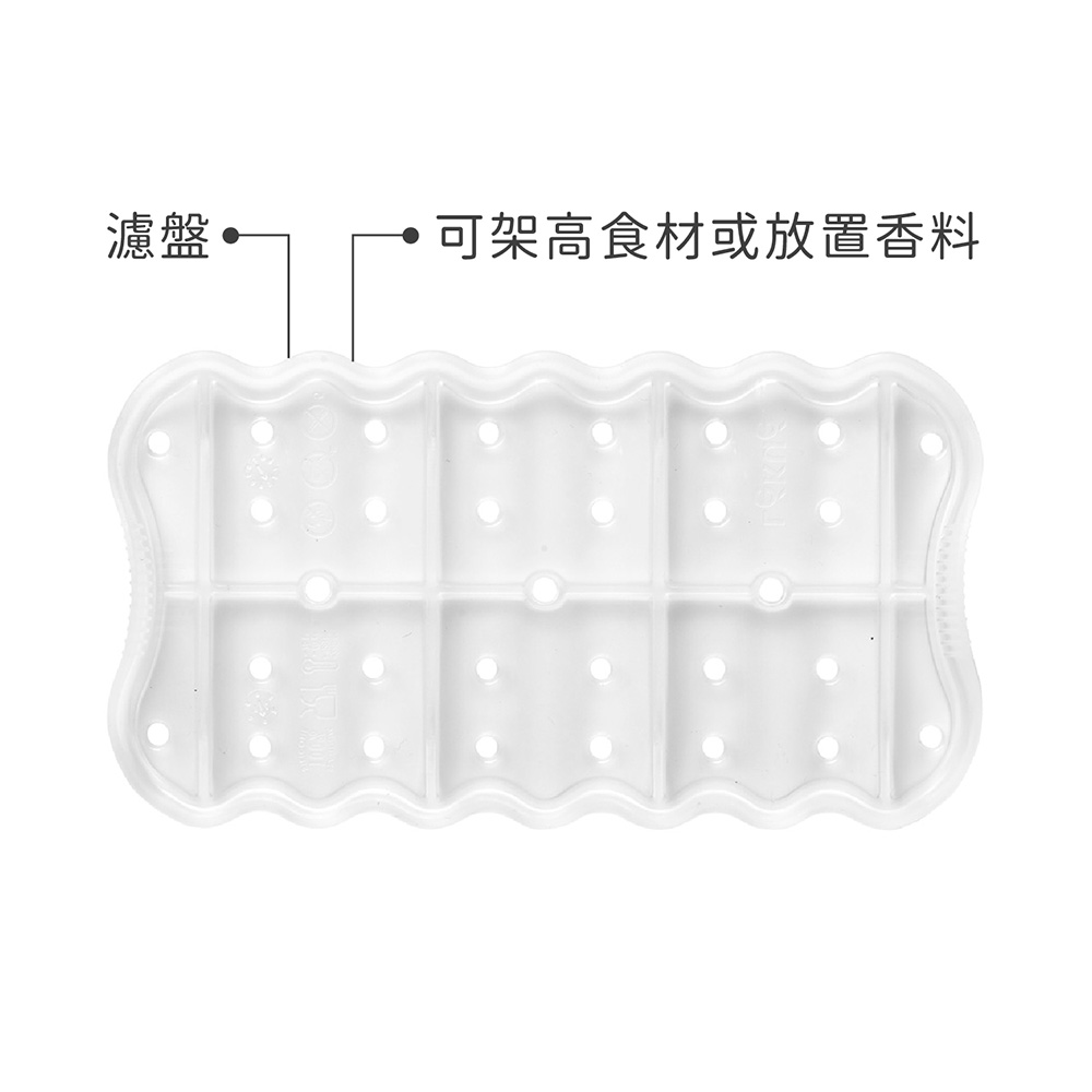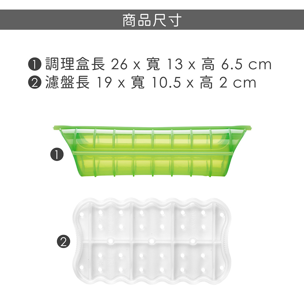尺寸:調理盒長 26 x 寬 13 x 高 6.5 cm、濾盤長 19 x 寬 10.5 x 高 2 cm