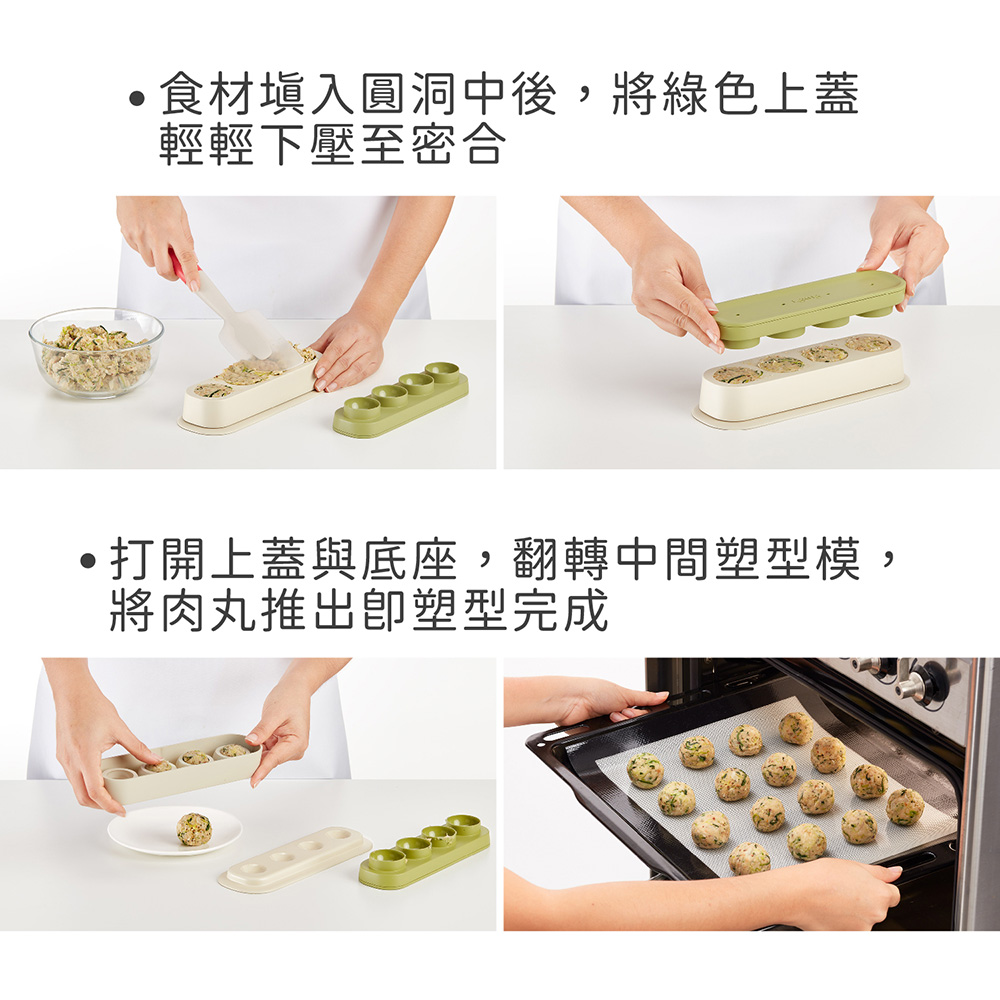 1. 本商品一組含上蓋、中間塑型模、底座各 x 1;耐熱度 -20~80 度C (-4~176 度 F);請遠離直接火源。