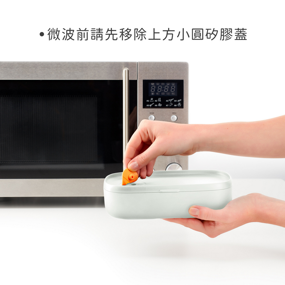 5. 適用微波 (3 分鐘以內);微波前請先移除上方小圓矽膠蓋;加熱或融化糖類、脂肪或油脂含量高的食物可能會導致破損。