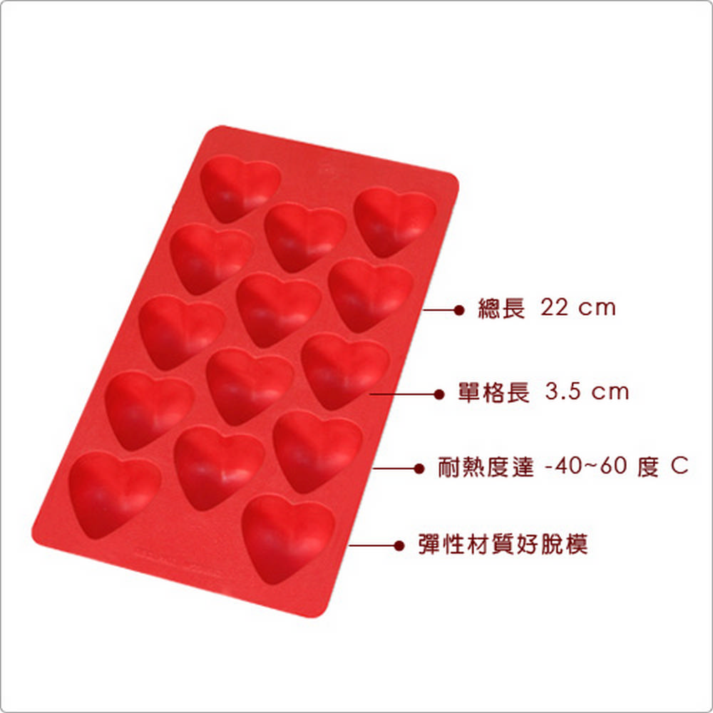 本商品一件入 (一次可製冰塊 x 14);耐熱度 -40~60 度C,適用冷凍冷藏、手洗清潔。享用沁涼可樂、冰醇咖啡時,試試此款愛心造型的製冰器,增添飲品風味。彈性材質方便您彎扭盒體取出冰塊,製冰盒也不會損傷;搭配底部加固設計,端拿不易因變形而溢出液體,且橡膠製具止滑效果,可穩放冰箱內防止滑動。製冰時可隨意加入香草葉、藍莓等香料果粒,讓透亮的冰塊變得繽紛且口感豐富。輕鬆製出造型可愛的冰塊,漂浮於飲品中也是注目的焦點。