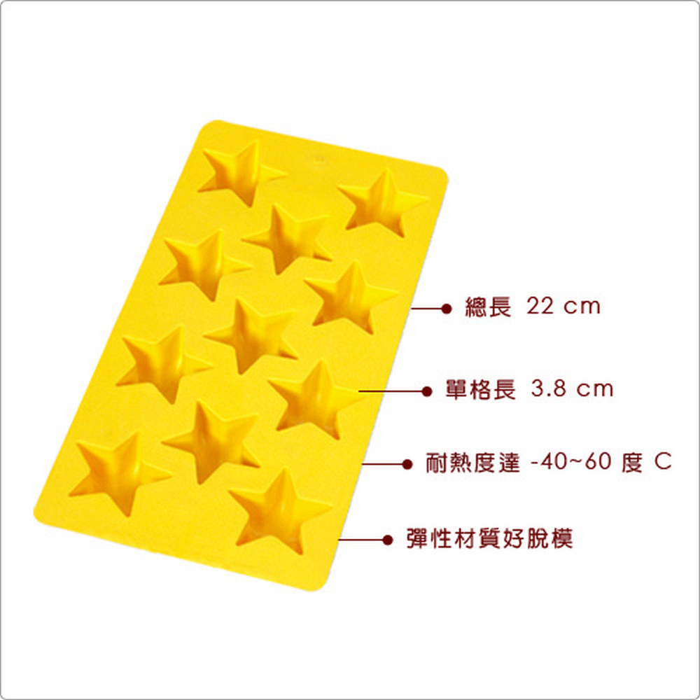 本商品一件入 (一次可製冰塊 x 11);耐熱度 -40~60 度C,適用冷凍冷藏、手洗清潔。享用沁涼可樂、冰醇咖啡時,試試此款星星造型的製冰器,增添飲品風味。彈性材質方便您彎扭盒體取出冰塊,製冰盒也不會損傷;搭配底部加固設計,端拿不易因變形而溢出液體,且橡膠製具止滑效果,可穩放冰箱內防止滑動。製冰時可隨意加入香草葉、藍莓等香料果粒,讓透亮的冰塊變得繽紛且口感豐富。輕鬆製出造型可愛的冰塊,漂浮於飲品中也是注目的焦點。