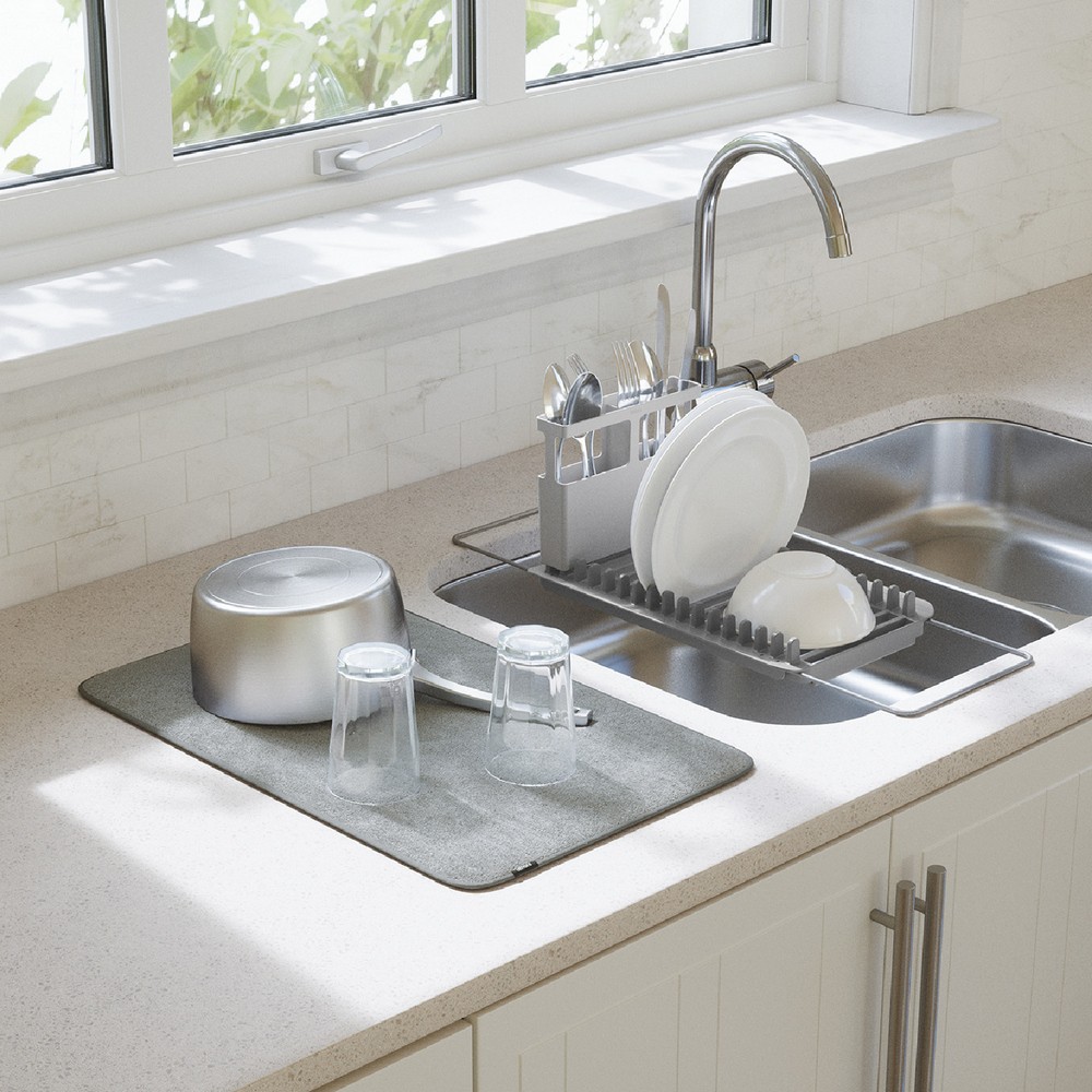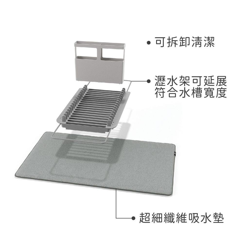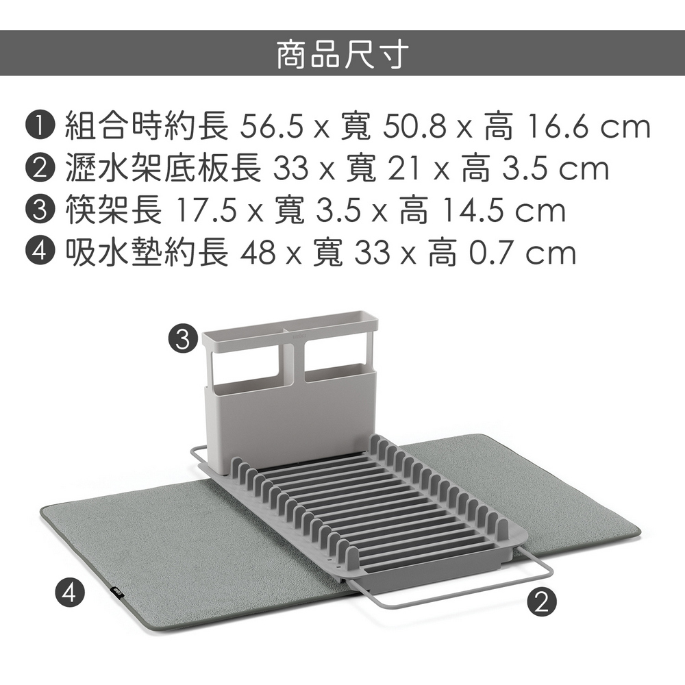 尺寸:組合時約長 56.5 x 寬 50.8 x 高 16.6 cm;瀝水架底板長 33 x 寬 21 x 高 3.5 cm、筷架長 17.5 x 寬 3.5 x 高 14.5 cm、吸水墊約長 48 x 寬 33 x 高 0.7 cm