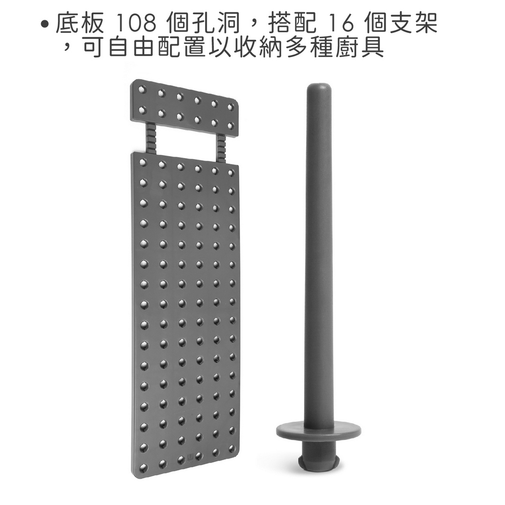 ※ 單入有 108 個孔洞,搭配 16 個支架,可自由配置以收納多種廚具。