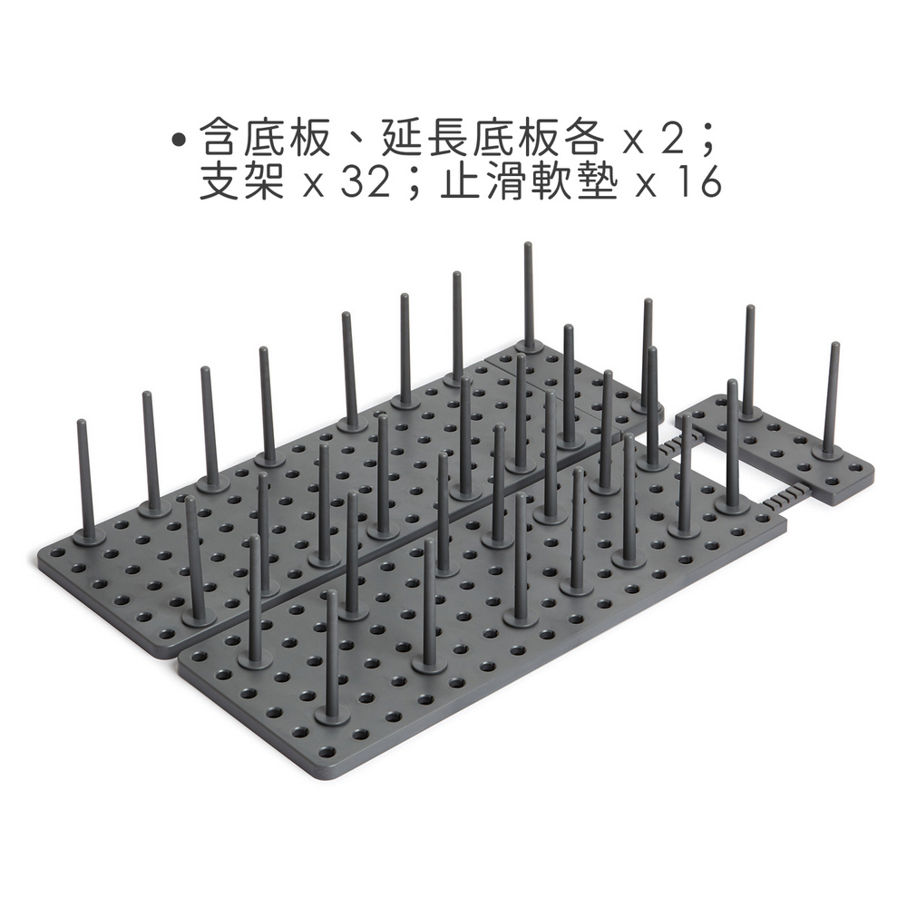 1. 本商品一組含底板、延長底板各 x 2;支架 x 32;止滑軟墊 x 16。