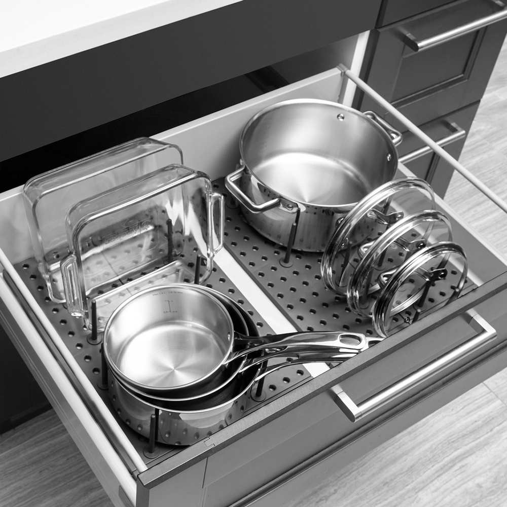 清洗完的碗盤餐具,無法直接放入櫥櫃收納,這時需要一款好用的瀝水架輔助您風乾。推薦此款瀝水收納架,自由組裝的特性,可根據家中鍋具大小隨心配置;亦可放入櫥櫃中,作為餐盤置放架使用,是收納整理的實用幫手。
