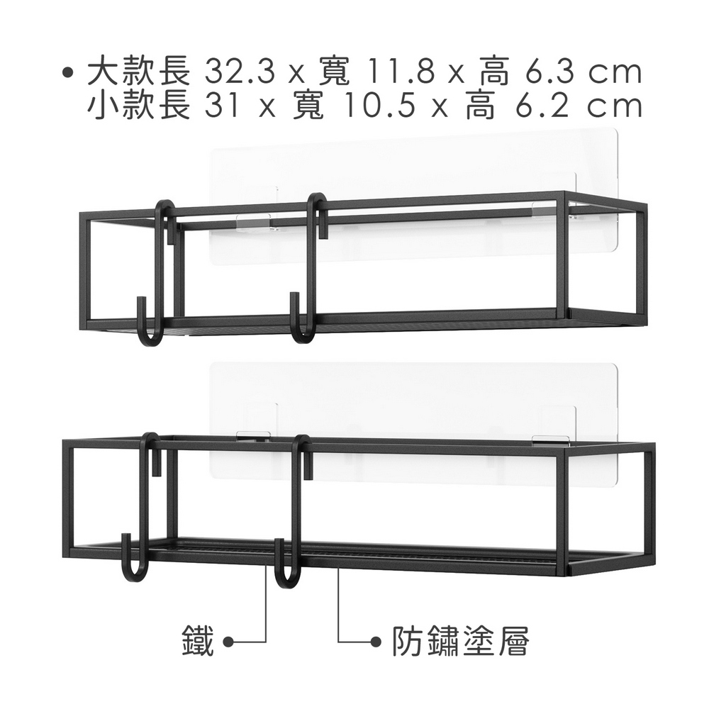 1. 本商品一組含大小置物架各 x 1、無痕掛勾貼 x 2、S 型掛勾 x 4。
