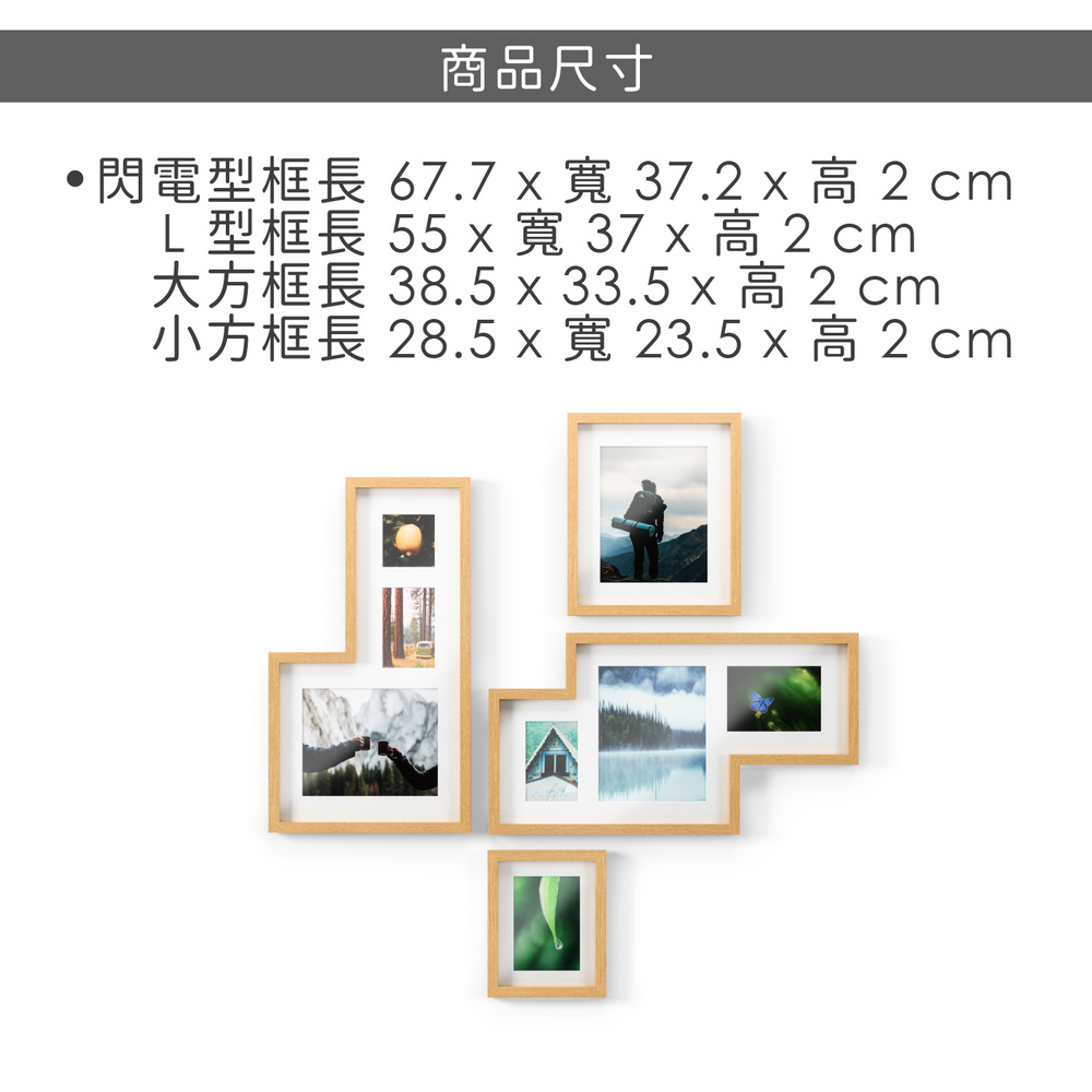 尺寸:閃電型框長 67.7 x 寬 37.2 x 高 2 cm、L 型框長 55 x 寬 37 x 高 2 cm、大方框長 38.5 x 33.5 x 高 2 cm、小方框長 28.5 x 寬 23.5 x 高 2 cm