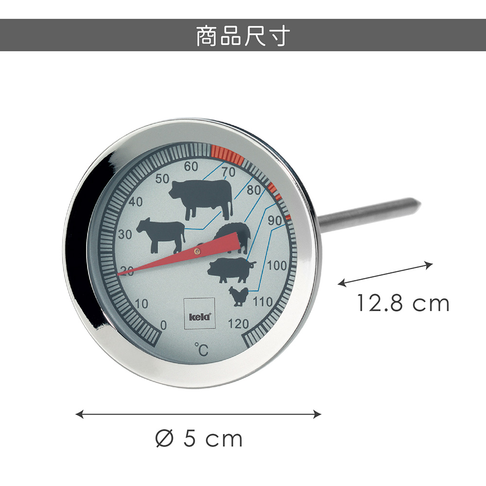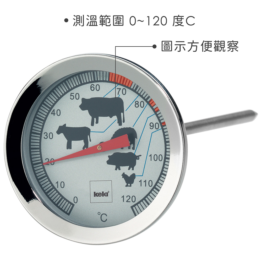 ※ 指針表面標示圖示方便觀察使用,共有牛、羊、羔羊、豬、雞 5 種肉品圖示的最佳烹調溫度建議。