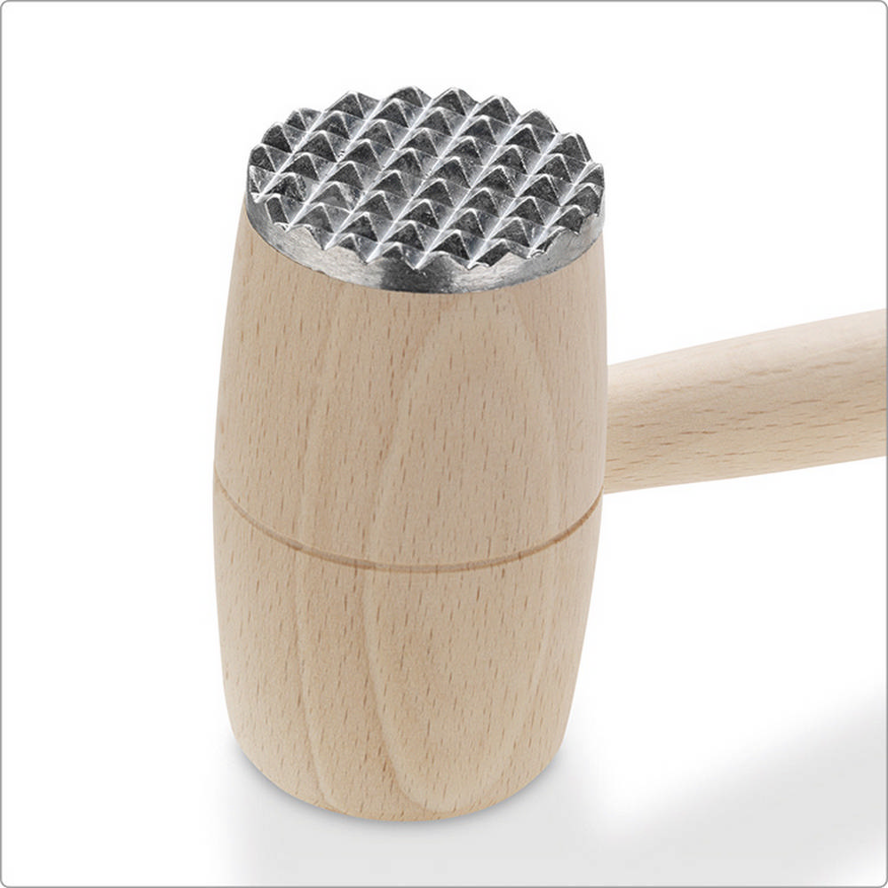 想烹煮出肉質鮮嫩的雞排、豬排、牛排,除了鮮美肉質,推薦您此款櫸木雙面肉錘。兩側分別為格狀尖齒、平面設計,尖齒端可輔助斷筋嫩肉、再用平面端充分坦平肉排,讓肉排呈現鮮甜美味;搭配木質曲線握柄觸感溫潤,方便施力好拿握,是您料理的好幫手。