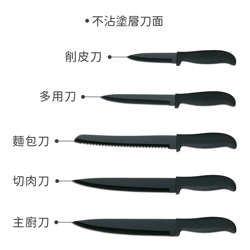 材質:不沾塗層、420/2CR14 不鏽鋼、PP 塑料