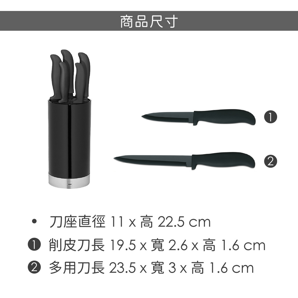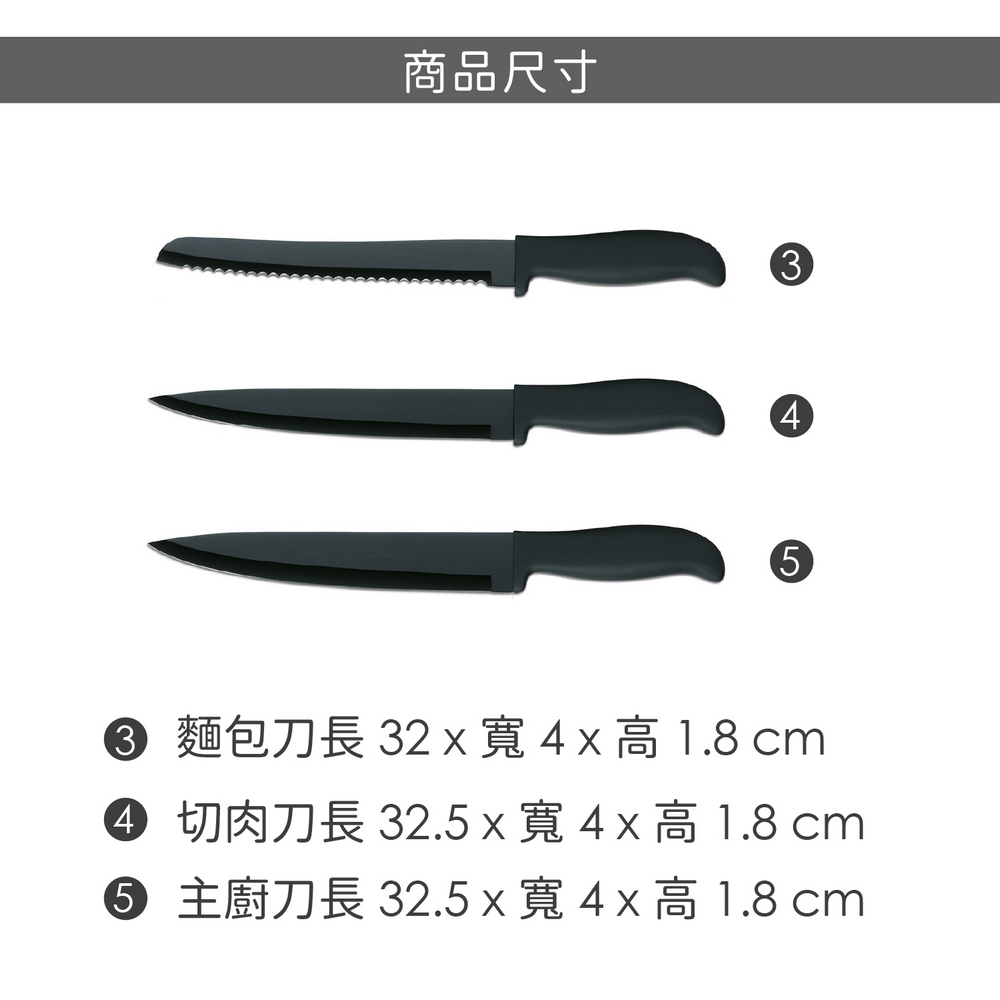 尺寸:主廚刀長 32.5 x 寬 4 x 高 1.8 cm、刀面長 19 cm;麵包刀長 32 x 寬 4 x 高 1.8 cm、刀面長 20 cm;切肉刀長 32.5 x 寬 4 x 高 1.8 cm、刀面長 19 cm;多用刀長 23.5 x 寬 3 x 高 1.6 cm、刀面長 12 cm;削皮刀長 19.5 x 寬 2.6 x 高 1.6 cm、刀面長 8 cm;刀座直徑 11 x 高 22.5 cm