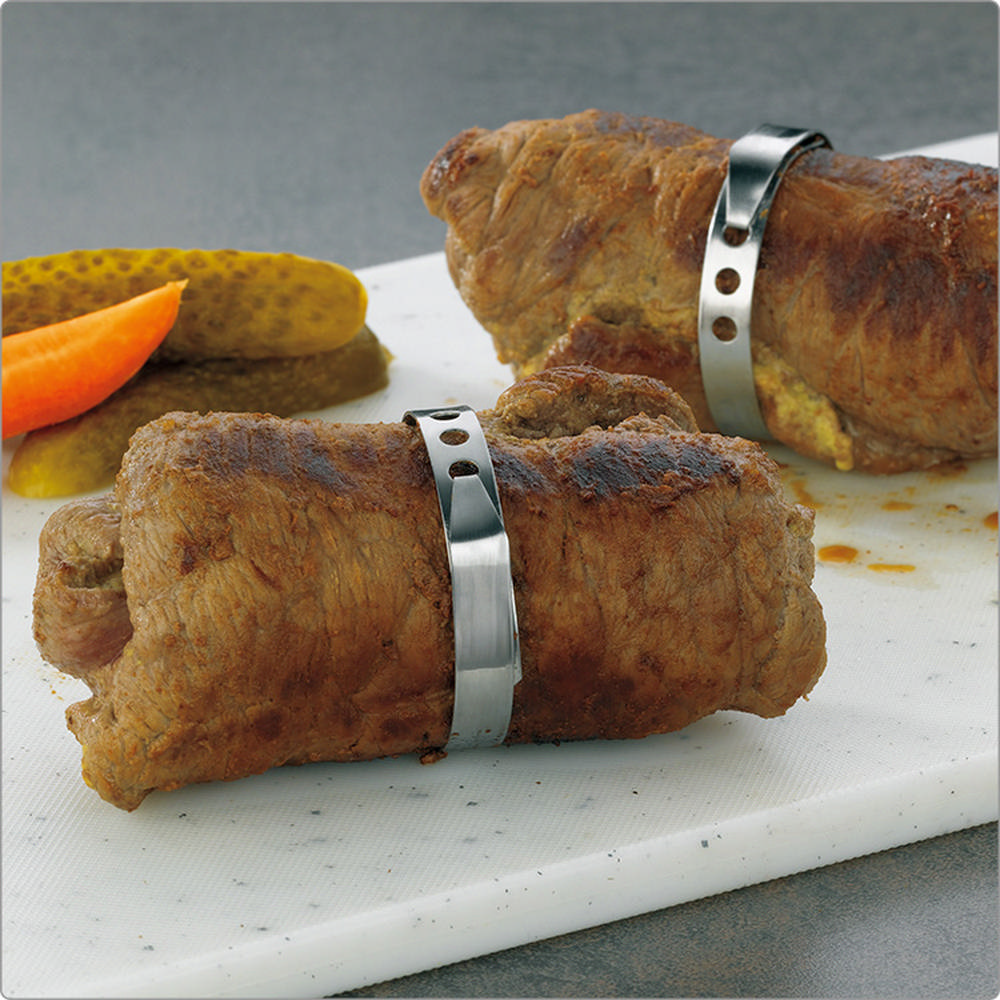 在外露營烤肉不免想多些變化,做個蔬菜捲或填滿餡料的肉捲,推薦您此款料理圈環。可輔助將裝填濃郁起司或多層式的肉捲,固定塑型,亦可輔助燉煮高麗菜捲時的綑束,是您料理時的好幫手。