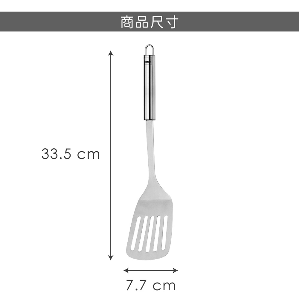 尺寸:平放時長 33.5 x 寬 7.7 x 高 4 cm;鏟面長 9.8 x 寬 7.8 cm;濾孔長約 5.5 x 寬 0.5 cm