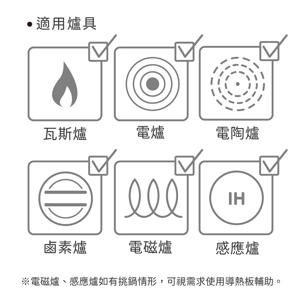 4. 適用瓦斯爐 (火焰勿超過鍋底)、鹵素爐、電陶爐、電爐、電磁爐、IH 爐等爐具 (如有挑鍋情形可視需求使用導熱板輔助),並請選擇適當尺寸之爐具使用。