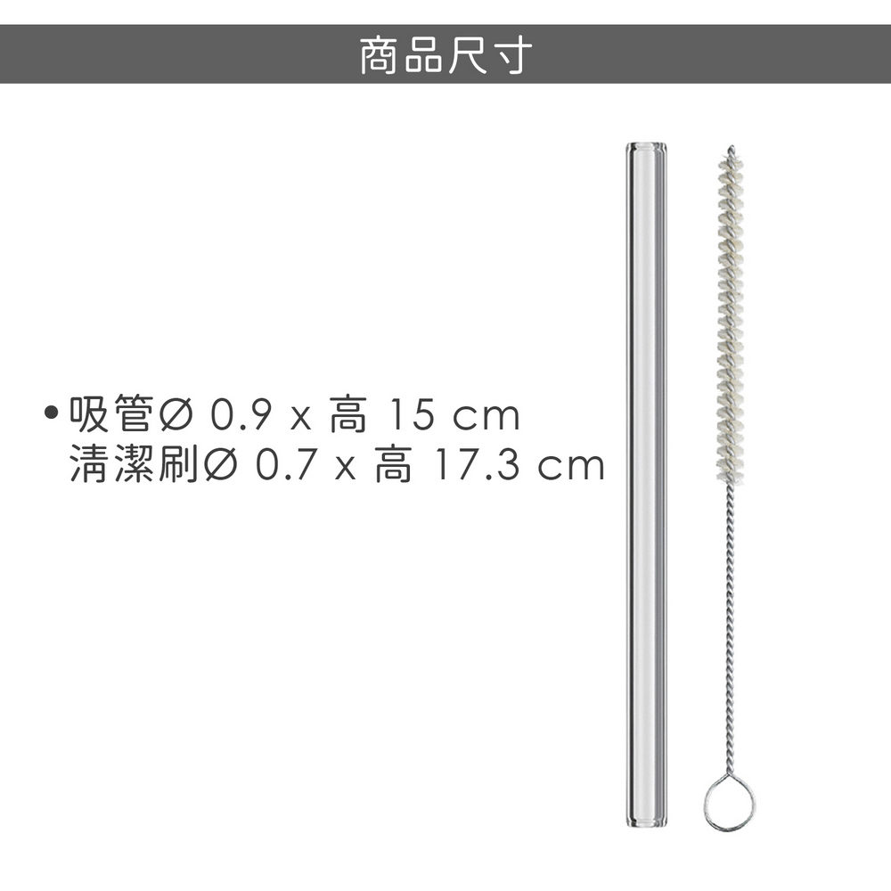 尺寸:單支吸管直徑 0.9 x 高 15 cm、內徑 0.6 cm;清潔刷直徑 0.7 x 高 17.3 cm