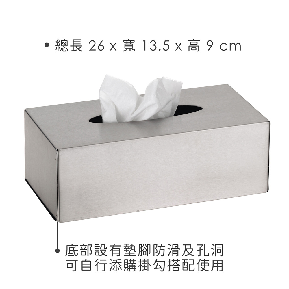 居家常使用的衛生紙、面紙常有各式不同的包裝,此款面紙盒可輔助您美觀收納,使整體環境更有一致性。不鏽鋼外型簡約質感,可擺放於客廳、臥室或衛浴等空間;底蓋具孔洞亦可吊掛收納節省空間,是居家及飯店、民宿的推薦選擇。