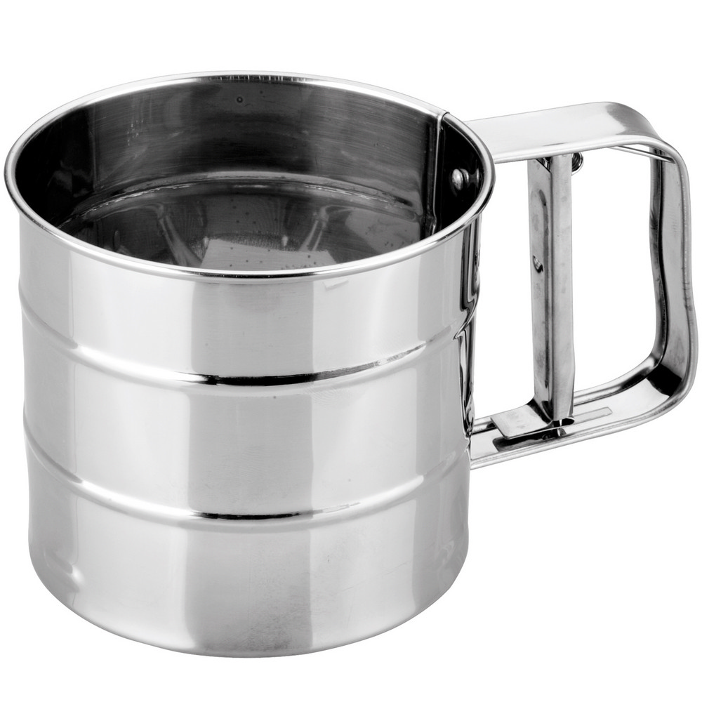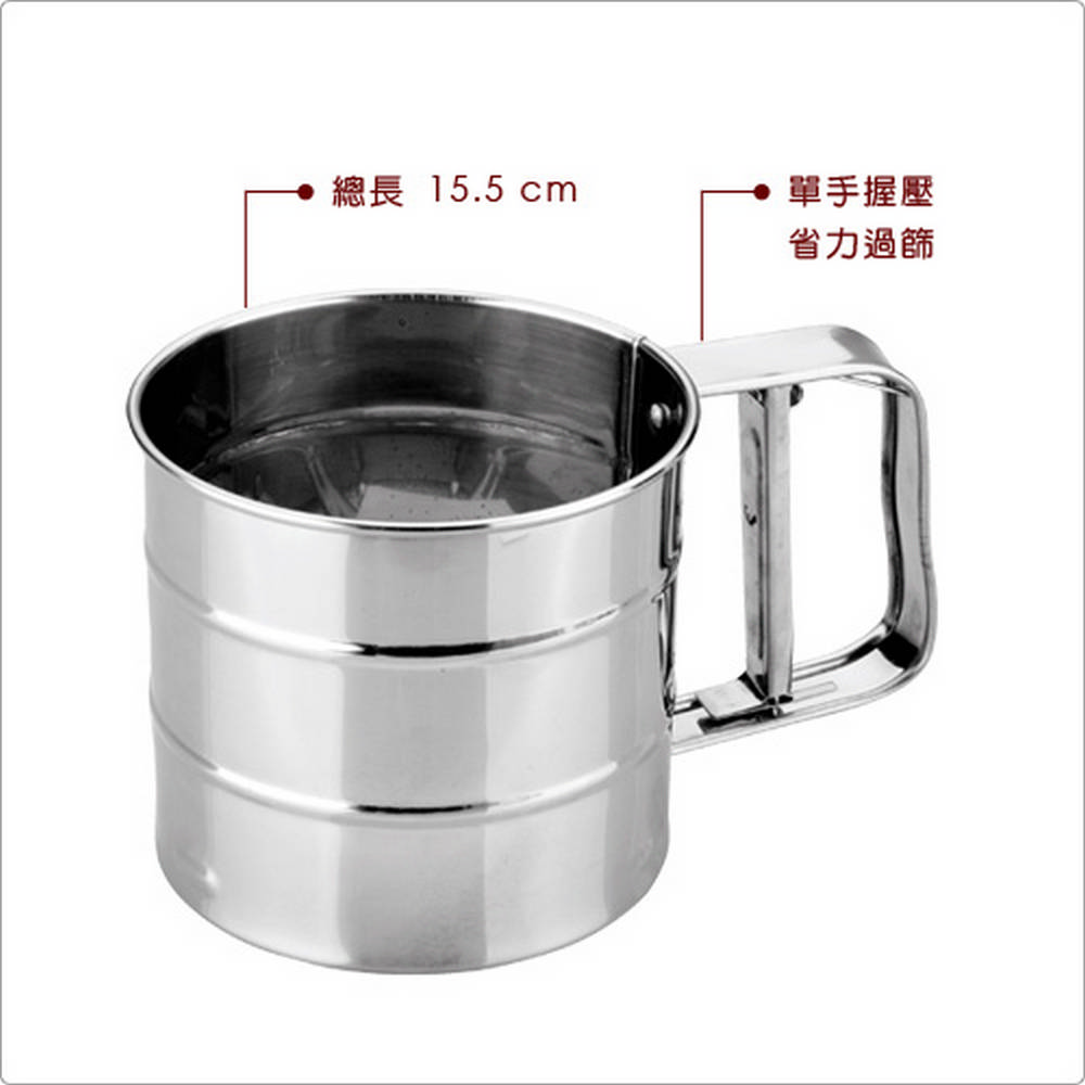 本商品一件入、容量最多可裝 250 g 麵粉,適用手洗清潔並保持乾燥。悠閒的下午,就來做點心吧,聞著空氣中飄散的微焦香氣,心情都好起來了。推薦您此款麵粉篩,設有刻度標示可輔助測量內裝量 (裝填至底部數來第一條標線為 125 g 麵粉;繼續裝填至第二條標線為 250 g 麵粉);過篩時只需握放麵粉篩手把彈簧數次,內側篩子來回運動,即可讓顆粒細小的麵粉通過篩網,去除顆粒過大的麵粉,讓粉質更細;充滿空氣的麵粉可使糕餅更為蓬鬆可口,適合用來過篩麵粉、糖粉、可可粉等;大容量且開放式篩口,方便直接從麵粉袋裡舀取麵粉,亦可用來填入少量糖粉裝飾點心與擺盤,是烘焙時不可或缺的工具。