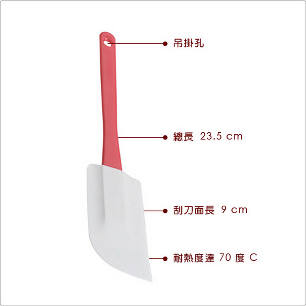 本商品一件入、耐熱度 70 度C,適用洗碗機、不沾鍋具;請遠離直接火源、料理時請勿長時間將握柄靠至鍋緣,可能受損或高溫燙傷。喜愛西點烘焙或自己動手製作蛋糕及甜點的您,推薦您此款刮刀,長柄方便伸到打蛋盆的角落使用,是攪拌奶油、麵糊的好幫手;搭配略有彈性的寬版刀面,可輔助輕鬆刮除調和好的麵糊倒入烤盤,以及同時均勻抹平;可吊掛收納省空間,是您烘焙料理不可或缺的單品。