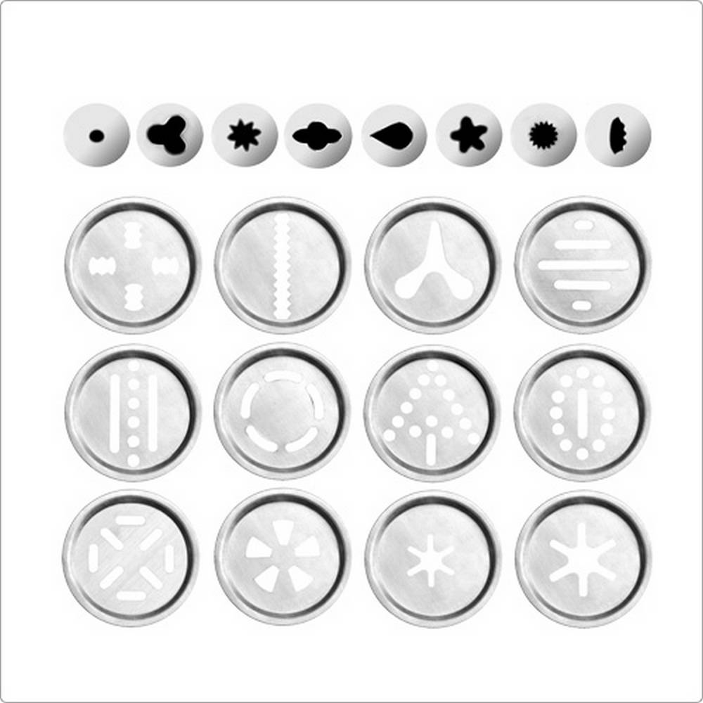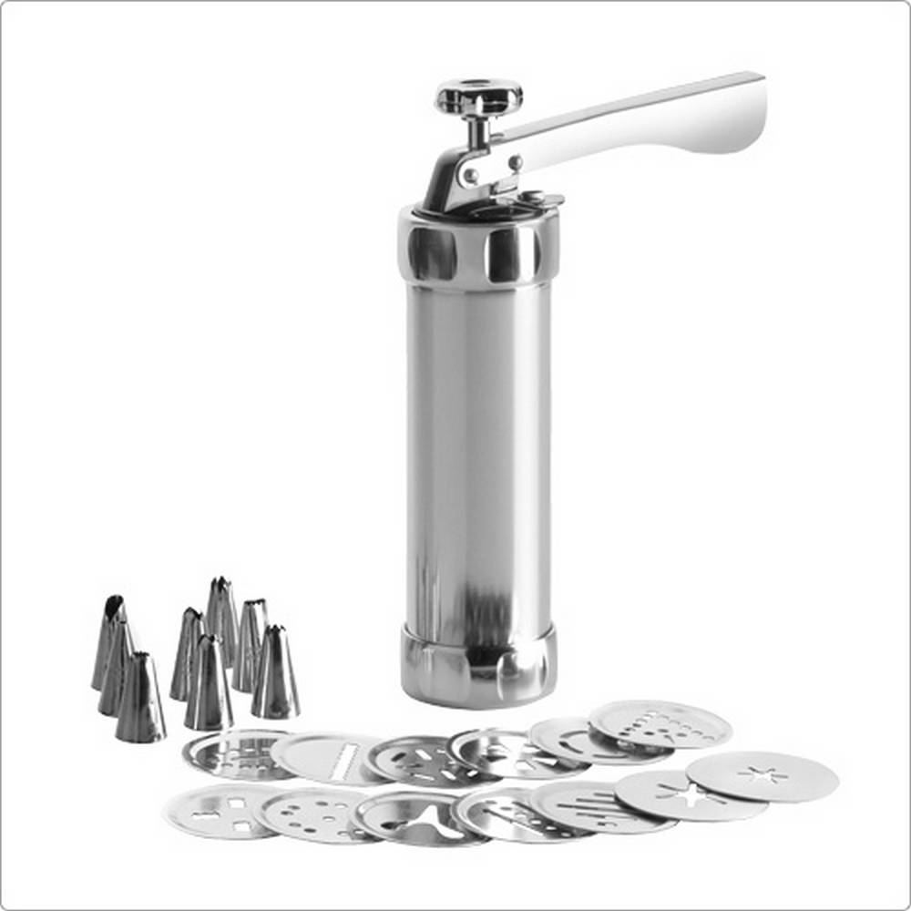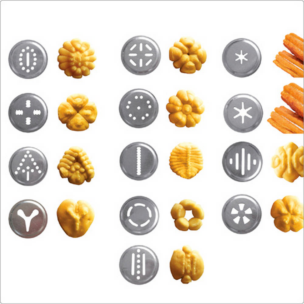 本商品一組含擠花槍 x 1、花嘴 x 8 (扁齒、玫瑰、葉齒、圓型、三齒花、五齒花、八齒花、16 齒花)、餅乾造型模片 x 13。容量約 200 ml、適用洗碗機並保持乾燥。Sweet 系列,以粉嫩色系呈現繽紛可愛的氛圍,發展出翻糖點心、烘焙裝飾的工具。想在家輕鬆製作造型餅乾、酥脆小油條,或是於蛋糕上擠花裝飾,推薦您此款擠花槍組。需裝填奶油或麵糊時,請單手手握握柄並將擠花槍口朝前方,同時將後方拉桿向後拉至底 (向後拉時鋸齒刻紋需朝上,請旋轉拉桿調整位置;完成後,請將拉桿鋸齒刻紋轉回下方朝向握柄),再旋開擠花槍口圈環,即可於擠花槍口填充。若需製作餅乾,請將餅乾擠壓模片放置於圈環內側後與擠花槍口結合,即可按壓握把輕鬆將內餡往前擠壓;若需於糕點上擠花裝飾,請先將轉接頭及所需之造型花嘴結合,並放入於圈環內側後與擠花槍口結合,即可輕鬆按壓握把將內餡往前擠壓於糕點上擠花裝飾;可依擠壓量需求調整握柄與填陷筒結合處金屬片,依上方箭頭指向之數字 (1、2) 逆時針或順時針撥動 (1 代表一次擠壓出內餡量較少,2 代表一次擠壓出內餡量較多)。可拆卸清洗,洗淨後以收納盒收納,既整齊又省空間,簡易實用、是您烘焙點心不可或缺的單品。