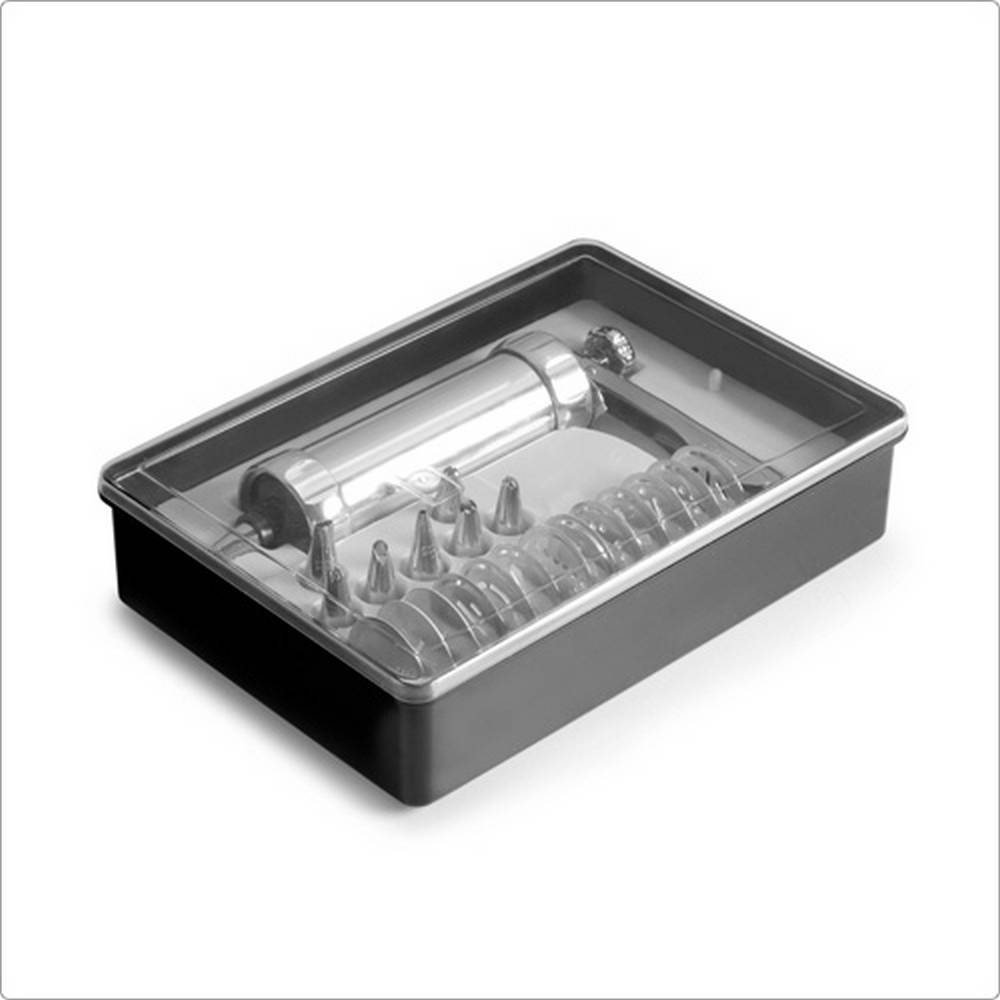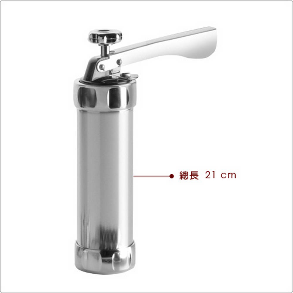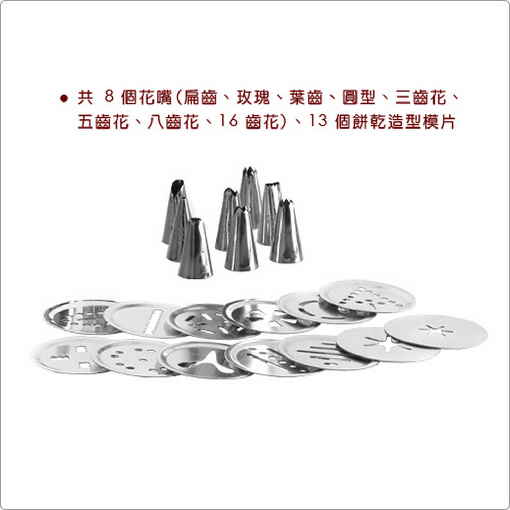 尺寸:平放收納時長 30.5 x 寬 21.5 x 高 7 .2 cm;擠花槍長 21 x 寬 15.5 x 高 5.5 cm、花嘴直徑 1.7 x 高 3.1 cm (圓孔徑 0.2 cm、玫瑰長 0.8 cm、八齒花孔徑 0.5 cm)、餅乾擠壓模片直徑 5 x 高 0.2 cm
