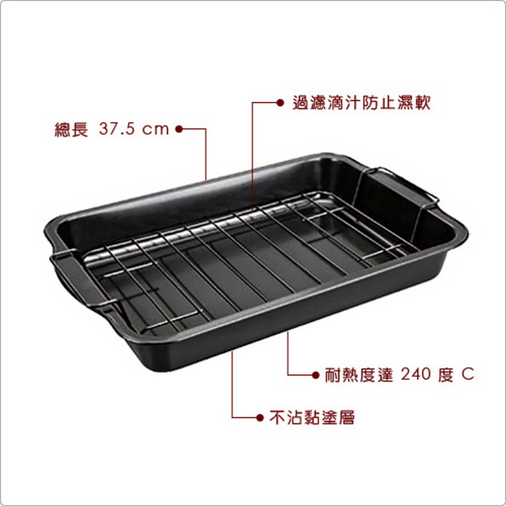 本商品一組含烤盤、烤架各 x 1(可拆卸清潔),耐熱度 240 度C,適用烤箱、洗碗機並保持乾燥 (手洗清潔時請勿使用鋼刷);表面為不沾塗層 (建議適度抹油更能提升不沾效果);請勿使用尖銳器具 (如刀叉) 等,避免破壞塗層。想要烤出美味的肉排、烤雞等豐盛大餐,不能讓滴流的烤汁泡軟食材,推薦您此款過濾烤盤。長方型且有深度的烤盤,適合料理烤雞、肉排魚片、或烤焗麵、義式煎烤蔬菜等;搭配烤架,肉汁可直接滴流至烤盤底部,不擔心泡軟食材;亦可單獨使用烤盤烘烤布朗尼、餅乾塊或水果鬆糕等點心。不沾黏塗層也方便您烤後快速享用、方便清潔。烤箱出爐時請搭配隔熱手套拿取,避免燙傷。