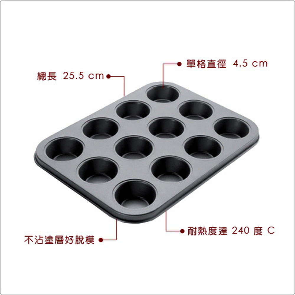 本商品一件入 (共 12 格、單格直徑 4.5 cm),耐熱度 240 度C (請勿接觸直接火源),適用烤箱、洗碗機並保持乾燥 (手洗清潔時請勿使用鋼刷);表面為不沾塗層,可幫助脫模減少沾黏 (建議適度抹油、沾點麵粉或搭配烘焙紙,更能提升不沾效果);模具上請勿使用尖銳器具 (如刀叉)等,避免破壞塗層。悠閒的下午就來做點心吧,看著熱騰騰的點心、蛋糕出爐,心情都好起來了。傳統平盤式搭配 12 格獨立烤模設計,可一次烘焙多個迷你瑪芬蛋糕,再加入蘋果、藍莓、椰子等不同乾果,不沾黏特性好脫模讓您烤後方便快速享用;搭配圓潤的弧邊好拿握不割手,輕鬆享受美好的午茶時光;小巧的模具也適合迷你蛋塔、水果塔等糕點。