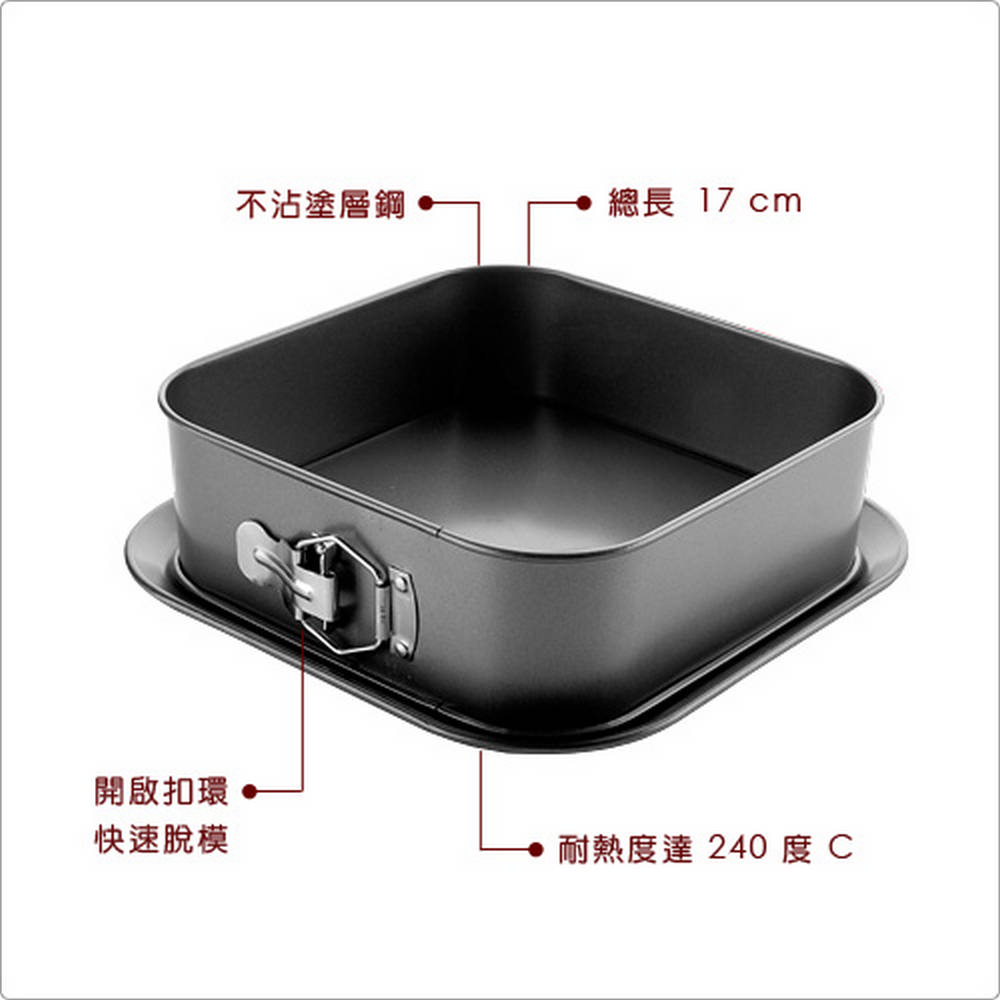 本商品一件入 (扣環式底盤可拆卸)、耐熱度 240 度C (請勿接觸直接火源),適用烤箱、洗碗機並保持乾燥 (手洗清潔時請勿使用鋼刷);表面為不沾塗層,可幫助脫模減少沾黏 (建議適度抹油、沾點麵粉或搭配烘焙紙,更能提升不沾效果);模具上請勿使用尖銳器具 (如刀叉) 等,避免破壞塗層。享受點心製作的成就,與家人或朋友們分享自製的美味糕點,度過愜意的午茶時光吧。扣環蛋糕烤模可在烘培時輔助定型不鬆散,強力的密合度可降低餡料外溢的機會 (可能因為餡料稠度而有所影響,偏液態的內餡建議搭配烘焙紙使用),非常適合起司蛋糕、水果鬆糕、海綿蛋糕等;烤後由側邊開啟扣環,輕鬆快速脫模不破壞點心型狀 (製作慕斯類請成型後再脫模);底盤加寬的貼心設計,方便您端拿或直接於盤上裝飾烤好的蛋糕、快速享用。