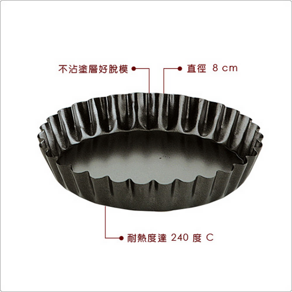 本商品一件入。享受點心製作的成就,與家人或朋友們分享自製的美味糕點,度過愜意的午茶時光吧。圓型塔模搭配波浪邊褶,稍淺的設計適合製作蘋果派、草莓塔或法式鹹派等各式甜鹹點心;當然也適用布丁、奶酪、果凍或起司蛋糕;較小的尺寸可製作 1 人份的甜點,輕巧無負擔。不沾黏特性好脫模讓您烤後方便快速享用,輕鬆享受美好的午茶時光。