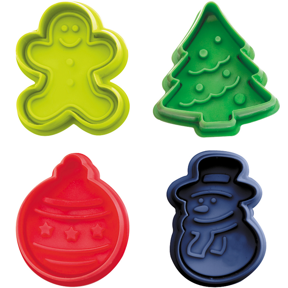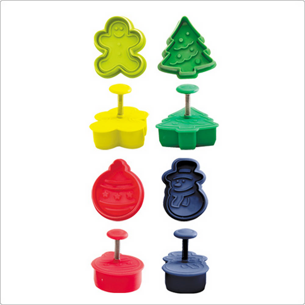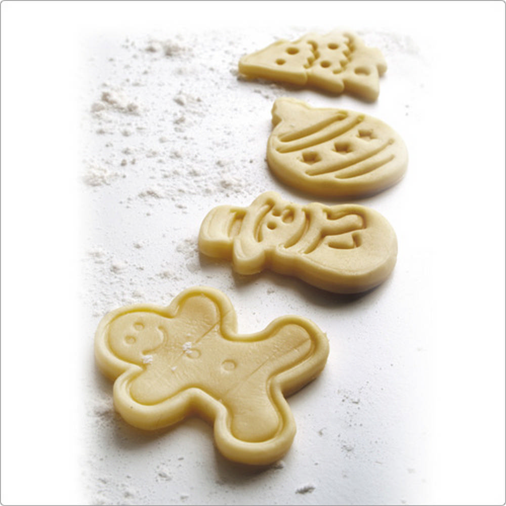 本商品一組含推壓模 x 4 (圖案有薑餅人、聖誕樹、彩球、雪人)、適用手洗清潔並保持乾燥、僅適常溫使用。想親手製作美麗精緻的餅乾可不簡單;利用簡單的模具,您也可以壓出細緻的主題圖案,輕鬆變身裝飾達人。使用時以蓋章方式將模具壓入餅乾麵皮,再按壓彈力壓柄便可推出切割好的圖型,正面有明顯且精緻的線條紋路,非常吸睛可愛;操作簡單適合與家中小朋友一起動手做點心,享受歡樂親子時光。另可當翻糖、黏土壓模使用,增添小朋友創作樂趣。