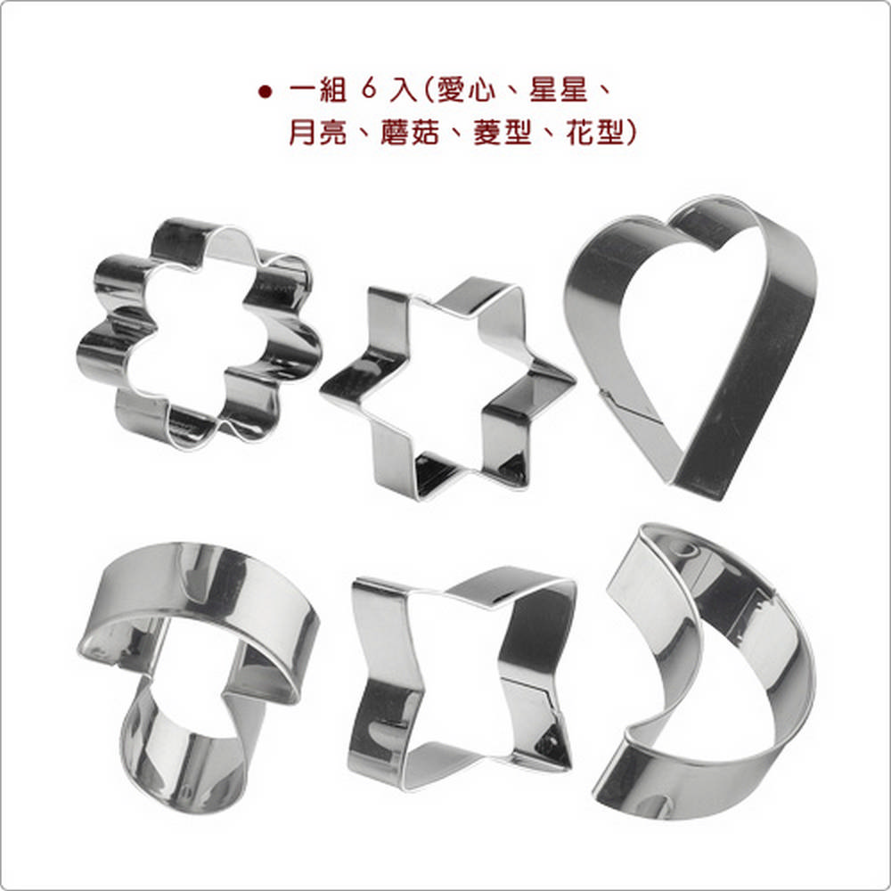 本商品一組含模具 x 6 (圖案有愛心、星星、月亮、蘑菇、菱型、花型),適用洗碗機並保持乾燥。喜愛烘焙及動手作餅乾的您,推薦您此款造型切模,僅需於麵糰上下壓切模,即可輕鬆壓切出可愛的造型餅乾,再作擠花、糖霜裝飾更可口吸睛,非常適合與家中小朋友一起動手做點心,享受歡樂親子時光。也可當作翻糖裝飾壓模、黏土壓模使用,增添小朋友創作樂趣,是您烘焙裝飾不可或缺的好幫手。