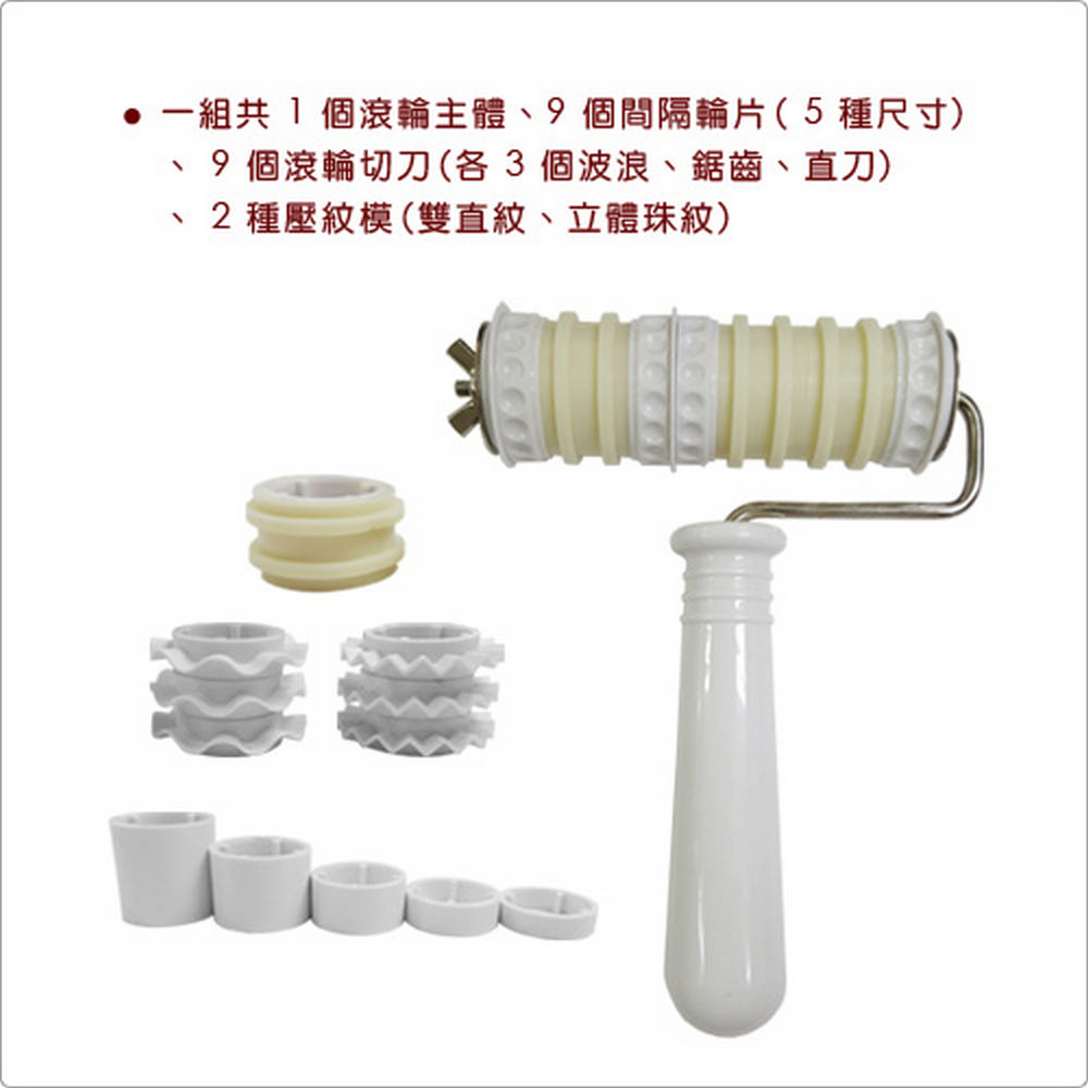 本商品一組含滾輪主體 x 1、間隔輪片 x 9 (含 5 種尺寸,分別為 0.6、0.8、1.3、1.9、2.5 cm);