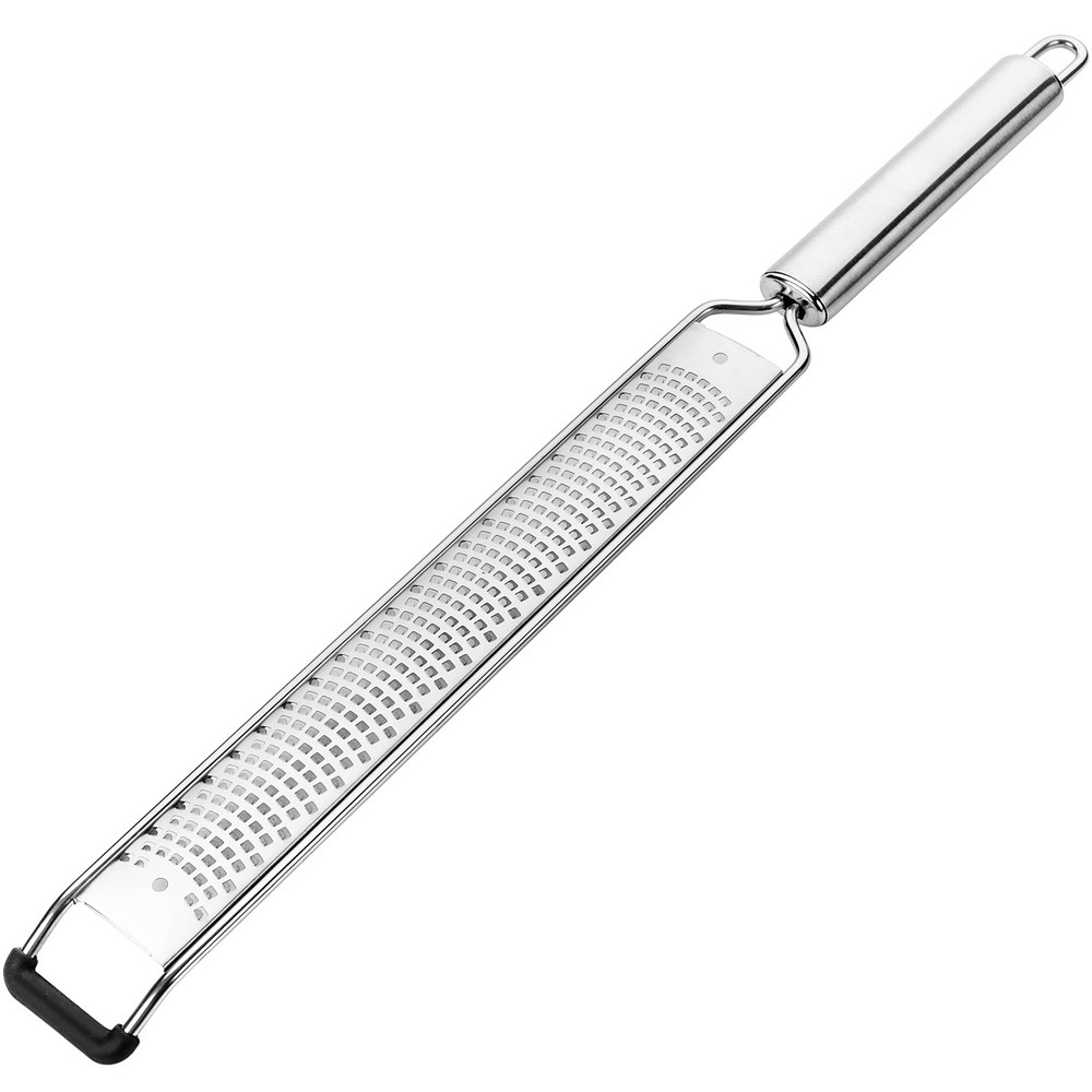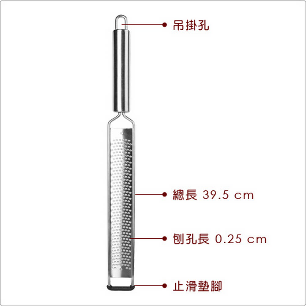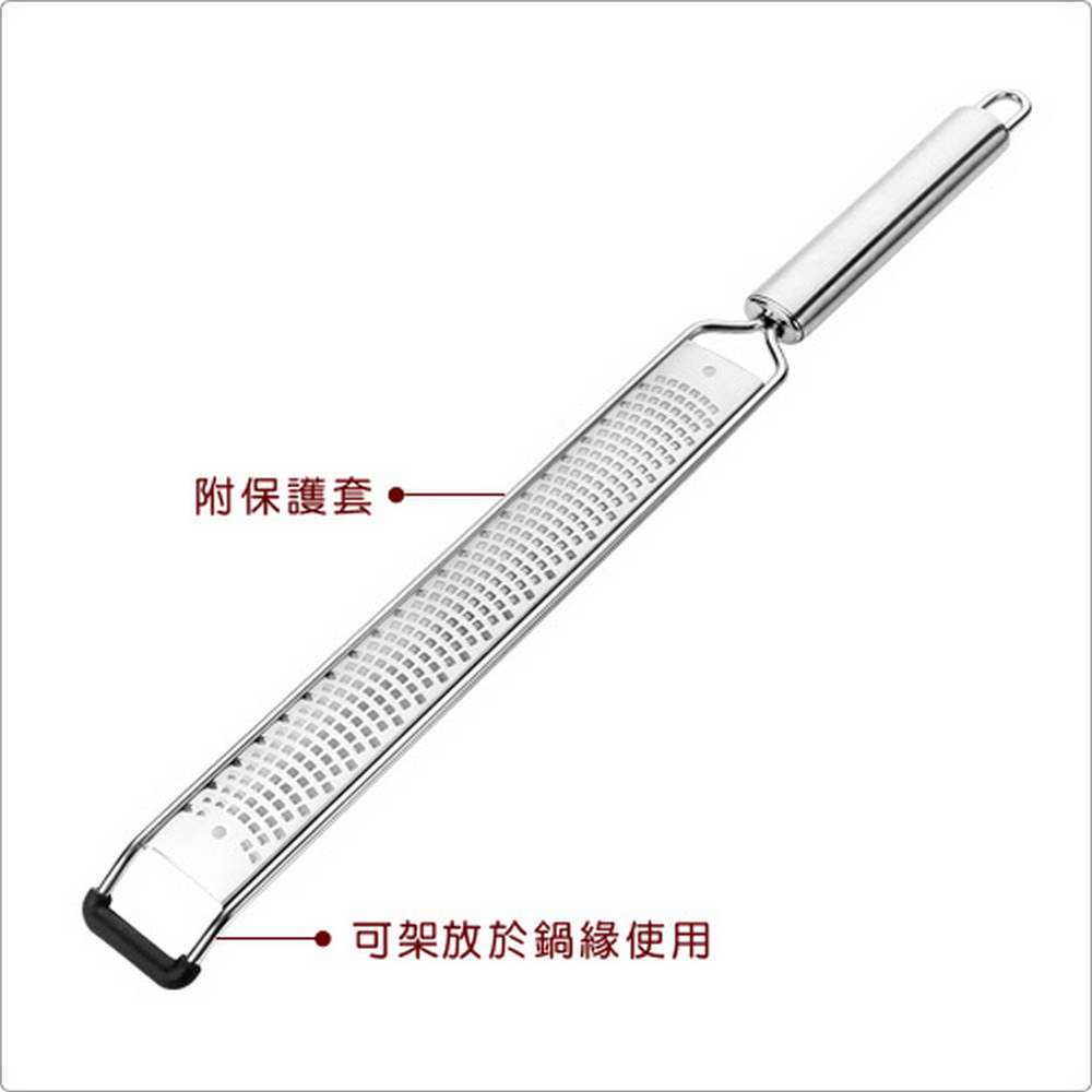 料理或烘焙前置少不了刨刀的幫忙,此款方孔刨刀適合處理偏硬的起司、巧克力或大蒜、薑末;前端具有止滑墊腳,適合架於鍋緣使用,刨屑後直接落入容器。保護套能讓您在洗淨風乾後,扣於刨刀面上,免於收納時被割傷;可吊掛收納不佔空間。