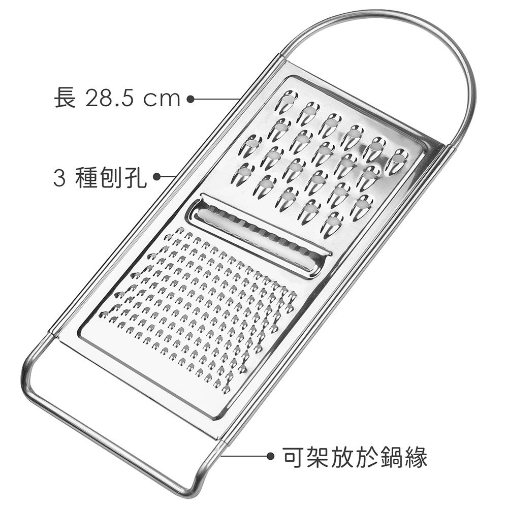 料理或烘焙裝飾,時常少不了刨刀的幫忙,讓您可快速俐落的刨出細絲。推薦您此款刨刀,寬版設計能更具效率刨切各式大小食材;3 種刨孔設計,方便您根據不同用途刨絲或刨片;亦可架放鍋邊,刨削後直接落入容器,是您廚房的好幫手。