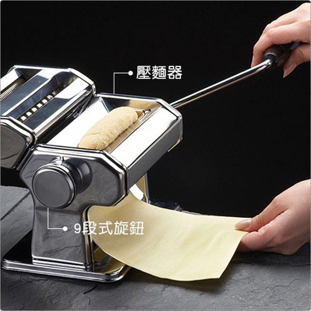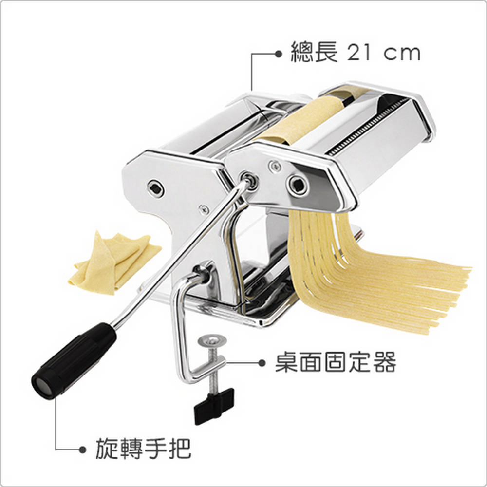 尺寸:組合時長 21 x 寬 20.2 x 高 15.7 cm;手柄長 17.3 x 寬 12.8 cm;麵皮切割器 10.6 cm;桌面固定器長 14.5 x 寬 6.3 cm;切麵器輪距分別為 0.6、0.2 cm