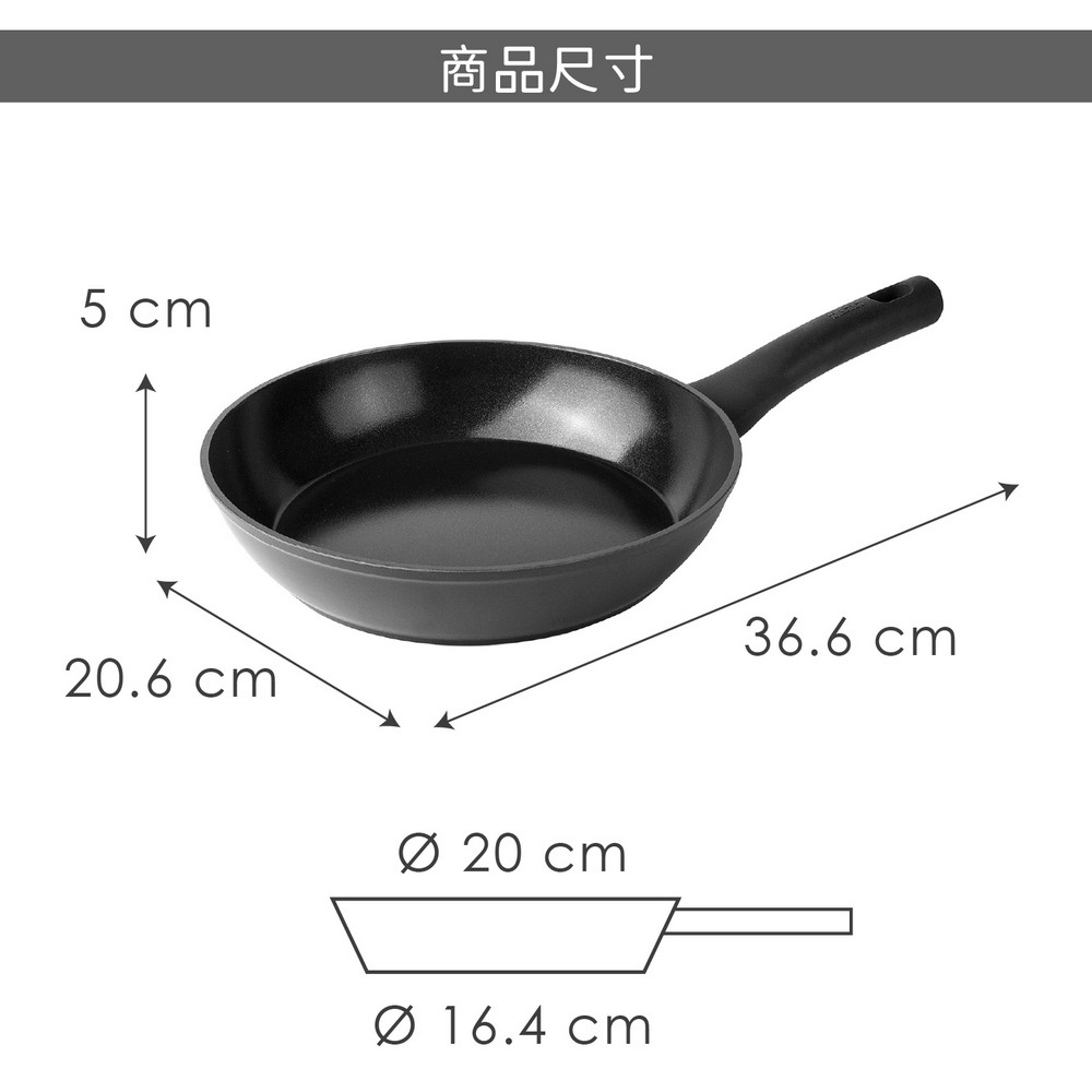 尺寸:含柄長 36.6 x 寬 20.6 x 高 5 cm;內徑 20 cm;底徑 16.4 cm