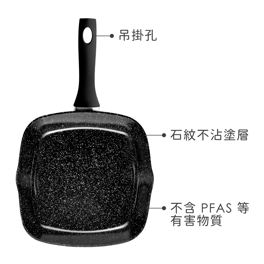 材質:石紋不沾塗層、鋁、18% 鋼、電木樹脂
