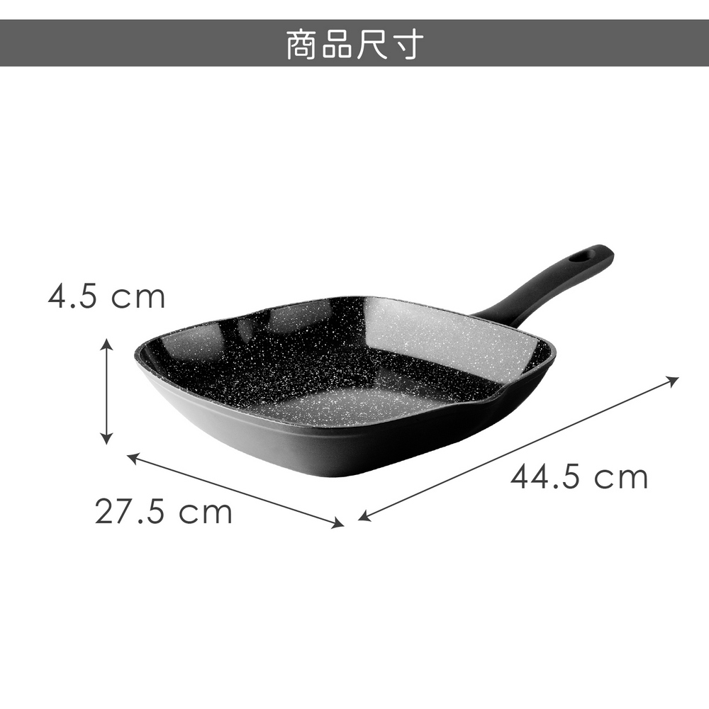 尺寸:含柄長 44.5 x 寬 27.5 x 高 4.5 cm;內徑 26 cm;底徑 17.8 cm